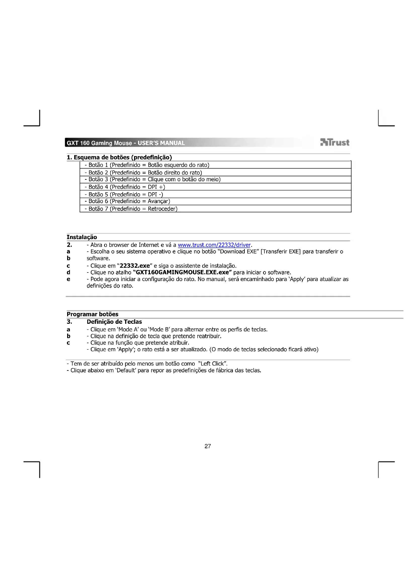 - Abra o navegador de Internet e vá até www.trust.com/22332/driver. - Escolha o seu sistema operacional e clique no botão “Download EXE” para fazer o download do software. - Clique em “22332.exe” e siga o assistente de instalação. - Clique no atalho “GXT160GAMINGMOUSE.EXE.exe” para executar o software. - Agora você pode começar a configurar o mouse. No manual constará “Apply” para atualizar as configurações do mouse.