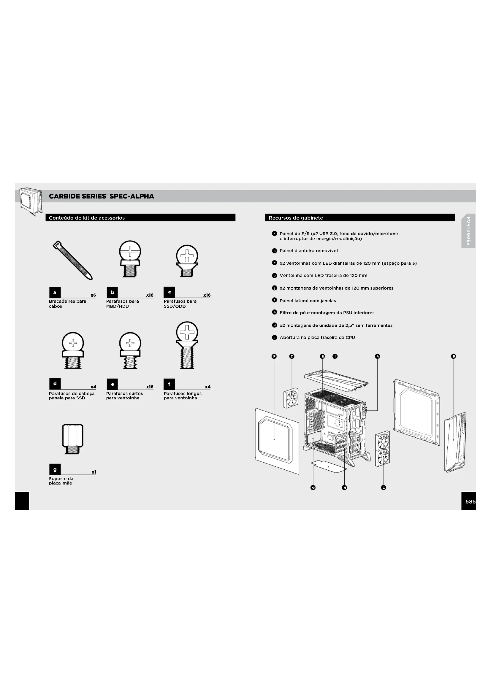 PORTUGUÊS Recursos do gabinete Conteúdo do kit de acessórios Painel de E/S (x2 USB 3.0, fone de ouvido/microfone e interruptor de energia/redefinição) Painel dianteiro removível x2 ventoinhas com LED dianteiras de 120 mm (espaço para 3) Ventoinha com LED traseira de 120 mm x2 montagens de ventoinhas de 120 mm superiores Painel lateral com janelas Filtro de pó e montagem da PSU inferiores x2 montagens de unidade de 2,5" sem ferramentas Abertura na placa traseira da CPU