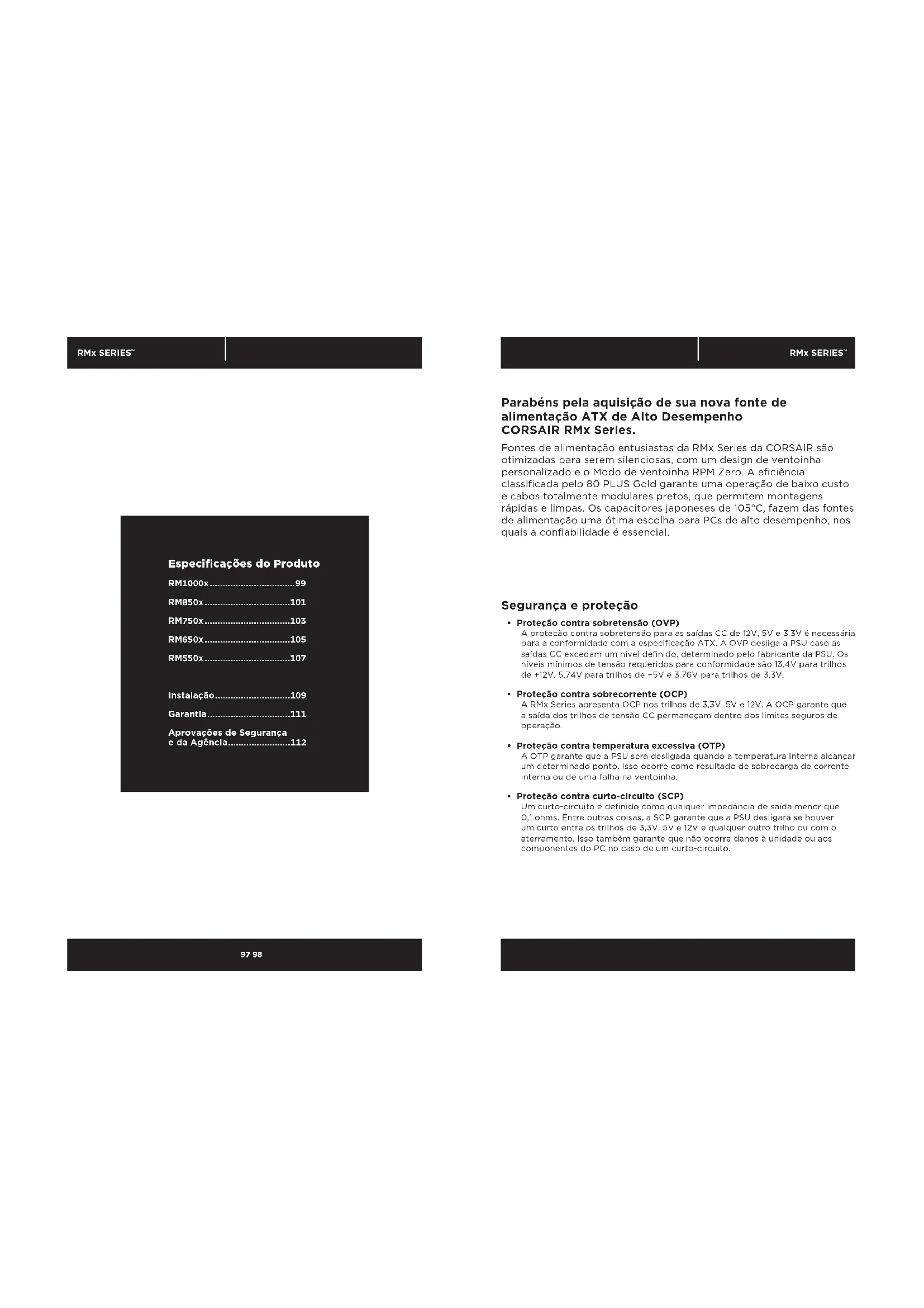 - Proteção contra curto-circuito (SCP) Um curto-circuito é definido como qualquer impedância de saída menor que 0,1 ohms. Entre outras coisas, a SCP garante que a PSU desligará se houver um curto entre os trilhos de 3,3V, 5V e 12V e qualquer outro trilho ou com o aterramento. Isso também garante que não ocorra danos à unidade ou aos componentes do PC no caso de um curto-circuito. Especificações do Produto RMx ................................. RMx ................................. RMx ................................. RMx ................................. RMx ................................. Instalação ............................. Garantia ................................ AprovaçõesdeSegurança edaAgência ........................99 100 RMx SERIES
