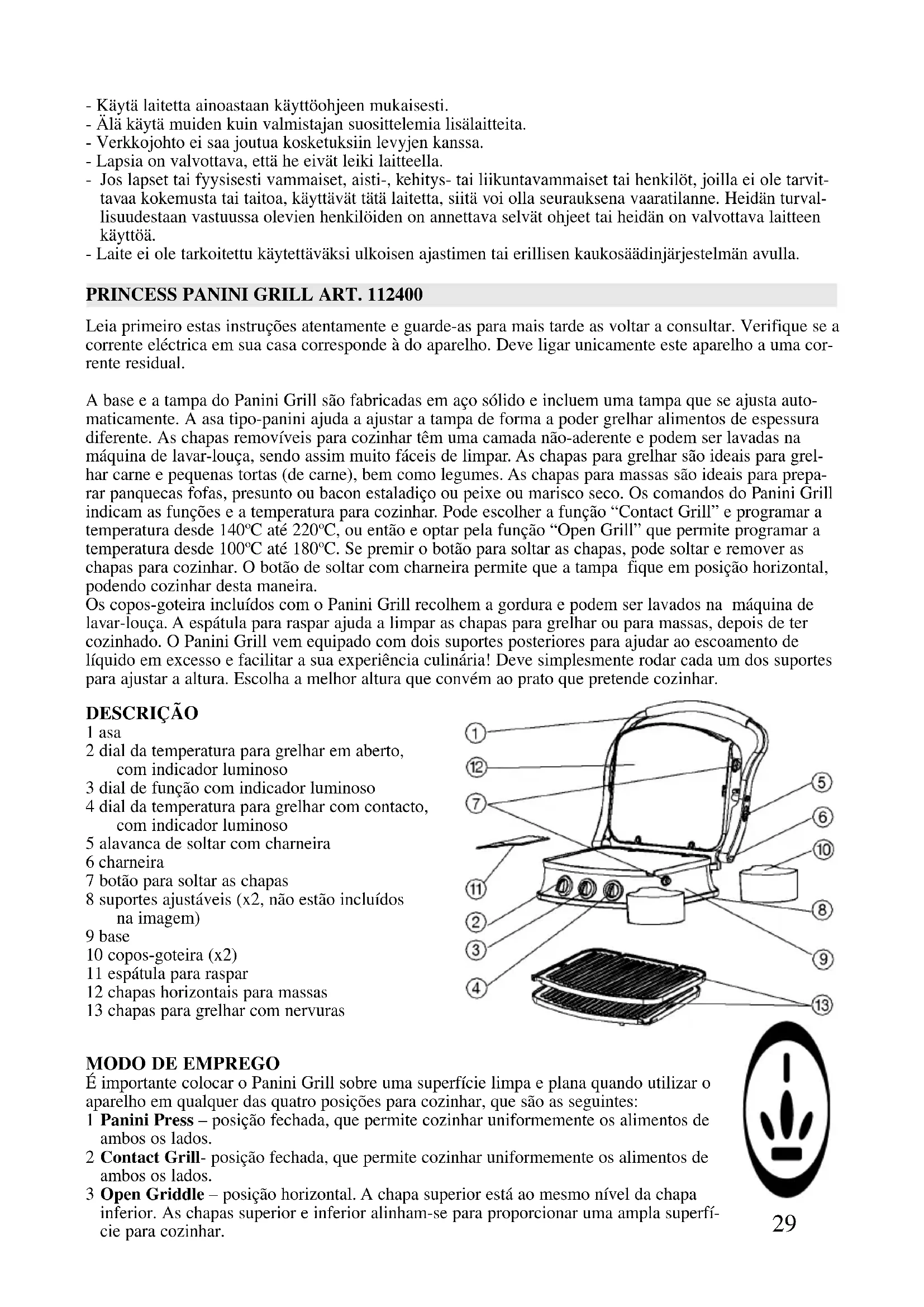Leia primeiro estas instruções atentamente e guarde-as para mais tarde as voltar a consultar. Verifique se a corrente eléctrica em sua casa corresponde à do aparelho. Deve ligar unicamente este aparelho a uma cor- rente residual. A base e a tampa do Panini Grill são fabricadas em aço sólido e incluem uma tampa que se ajusta auto- maticamente. A asa tipo-panini ajuda a ajustar a tampa de forma a poder grelhar alimentos de espessura diferente. As chapas removíveis para cozinhar têm uma camada não-aderente e podem ser lavadas na máquina de lavar-louça, sendo assim muito fáceis de limpar. As chapas para grelhar são ideais para grel- har carne e pequenas tortas (de carne), bem como legumes. As chapas para massas são ideais para prepa- rar panquecas fofas, presunto ou bacon estaladiço ou peixe ou marisco seco. Os comandos do Panini Grill indicam as funções e a temperatura para cozinhar. Pode escolher a função “Contact Grill” e programar a temperatura desde 140ºC até 220ºC, ou então e optar pela função “Open Grill” que permite programar a temperatura desde 100ºC até 180ºC. Se premir o botão para soltar as chapas, pode soltar e remover as chapas para cozinhar. O botão de soltar com charneira permite que a tampa fique em posição horizontal, podendo cozinhar desta maneira. Os copos-goteira incluídos com o Panini Grill recolhem a gordura e podem ser lavados na máquina de lavar-louça. A espátula para raspar ajuda a limpar as chapas para grelhar ou para massas, depois de ter cozinhado. O Panini Grill vem equipado com dois suportes posteriores para ajudar ao escoamento de líquido em excesso e facilitar a sua experiência culinária! Deve simplesmente rodar cada um dos suportes para ajustar a altura. Escolha a melhor altura que convém ao prato que pretende cozinhar. DESCRIÇÃO 1 asa 2 dial da temperatura para grelhar em aberto, com indicador luminoso 3 dial de função com indicador luminoso 4 dial da temperatura para grelhar com contacto, com indicador luminoso 5 alavanca de soltar com charneira 6 charneira 7 botão para soltar as chapas 8 suportes ajustáveis (x2, não estão incluídos na imagem) 9 base 10 copos-goteira (x2) 11 espátula para raspar 12 chapas horizontais para massas 13 chapas para grelhar com nervuras