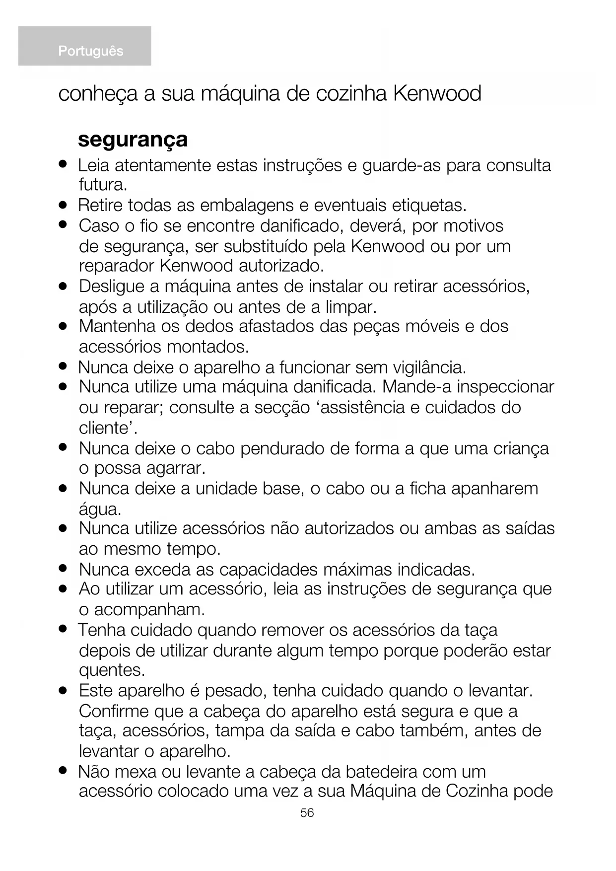 Não mexa ou levante a cabeça da batedeira com um acessório colocado uma vez a sua Máquina de Cozinha pode Português conheça a sua máquina de cozinha Kenwood56 57 ficar instável.