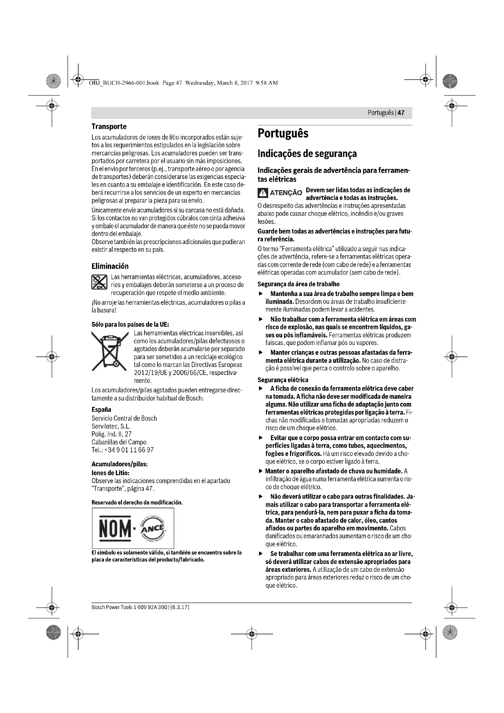 OBJ_BUCH-2966-001.book Page 54 Wednesday, March 8, 2017 9:58 AMPortuguês | 55 Bosch Power Tools 1 609 92A 3B0 | (8.3.17) Aspiração de pó/de aparas Pós de materiais como por exemplo, tintas que contém chumbo, alguns tipos de madeira, minerais e metais, po- dem ser nocivos à saúde. O contacto ou a inalação dos pós pode provocar reações alérgicas e/ou doenças nas vias respiratórias do utilizador ou das pessoas que se encon- trem por perto. Certos pós, como por exemplo pó de carvalho e faia são con- siderados como sendo cancerígenos, especialmente quan- do juntos com substâncias para o tratamento de madeiras (cromato, preservadores de madeira). Material que contém asbesto só deve ser processado por pessoal especializado. – Se possível deverá usar um dispositivo de aspiração apropriado para o material. – Assegurar uma boa ventilação do local de trabalho. – É recomendável usar uma máscara de proteção respira- tória com filtro da classe P2. Observe as diretivas para os materiais a serem trabalha- dos, vigentes no seu país. Evite o acúmulo de pó no local de trabalho. Pós podem entrar levemente em ignição. Conectar a aspiração de pó (acessório opcional) A aspiração de pó 20 só é destinada para trabalhos com a pla- ca de lixar 13 e não deve ser usada em combinação com ou- tras ferramentas de trabalho. Para lixar deverá sempre conectar a aspiração de pó. Para a montagem da aspiração de pó 20 (acessório) é neces- sário remover a ferramenta de trabalho e o limitador de pro- fundidade 15. Desloque a aspiração de pó 20 até ao batente, passando pelo suporte de acessório 10, em direção ao colar de aperto da ferramenta elétrica. Rode a aspiração de pó para a posição desejada (não diretamente por baixo da ferramenta elétrica). Pressione a alavanca tensora 21 para fixar a aspiração de pó. Encaixe o adaptador da mangueira de aspiração 18 no bocal de aspiração 19. Ligue a mangueira de aspiração 18 a um as- pirador (acessório). Uma vista geral sobre a conexão a diversos aspiradores de pó encontra-se na página de gráficos. O aspirador de pó deve ser apropriado para o material a ser trabalhado. Utilizar um aspirador especial para aspirar pó que seja extre- mamente nocivo à saúde, cancerígeno ou seco. Funcionamento Colocação em funcionamento Colocar o acumulador Nota: A utilização de acumuladores não apropriados para a ferramenta elétrica, pode levar a erros de funcionamento ou a danos na ferramenta elétrica. Introduzir o acumulador 4 carregado, por trás, no pé da ferra- menta elétrica. Premir o acumulador completamente para dentro do pé, até a linha vermelha não estar mais visível e o acumulador estar firmemente travado. Ligar e desligar Para ligar a ferramenta elétrica, deverá empurrar o interrup- tor de ligar-desligar 2 para frente, de modo que apareça o interruptor “I”. O arranque eletrónico suave limita o binário ao ligar o apare- lho e aumenta a vida útil do motor. A Constant-Electronic mantém o número de oscilações du- rante a marcha em vazio e sob carga quase que constante e assegura um desempenho de trabalho uniforme. Para desligar a ferramenta elétrica, deverá empurrar o inter- ruptor de ligar-desligar 2 para trás, de modo que apareça o in- terruptor “0”. Para poupar energia só deverá ligar a ferramenta elétrica quando ela for utilizada. A barra luminosa de 180° melhora a visibilidade do raio de ação. É ligada e desligada automaticamente com a ferramenta elétrica. Não olhar diretamente para a luz de trabalho pois poderá ser ofuscado. Pré-selecionar o número de oscilações Com a roda de pré-seleção do número de oscilações 6 é possível pré-selecionar o número de oscilações necessário durante o funcionamento. O n.º de oscilações necessário depende do material e das condições de trabalho e pode ser verificado através de en- saios práticos. Para serrar, cortar e lixar materiais mais duros, como por ex. madeia ou metal, é recomendável o nível de oscilação “6” e para serrar materiais mais macios, como por ex. plástico, é necessário o nível de oscilação “4”. Indicações de trabalho Espere a ferramenta elétrica parar completamente, antes de depositá-la. Retirar o acumulador antes de todos os trabalhos na ferramenta elétrica. Nota: Não obstruir as aberturas de ventilação 7 da ferramen- ta elétrica durante o trabalho pois isto reduzirá a vida útil da sua ferramenta elétrica. Ao trabalhar com ferramentas HCS deverá observar que o re- vestimento das ferramentas não esteja danificado. Princípio de trabalho Devido ao accionamento oscilante, a ferramenta de trabalho vibra até 20000 vezes por minuto 2,8° para lá e para cá. Des- ta forma é possível trabalhar com precisão em áreas estreitas. Trabalhar com reduzida e uniforme força de pressão, caso contrário o desempenho de trabalho é reduzido e a ferramenta de traba- lho pode bloquear. Movimentar a ferramenta eléctrica para lá e para cá durante o trabalho, para que a ferra- menta de trabalho não seja demasiadamen- te aquecida e não bloqueie. OBJ_BUCH-2966-001.book Page 55 Wednesday, March 8, 2017 9:58 AM56 | Português 1 609 92A 3B0 | (8.3.17) Bosch Power Tools Serrar Só utilizar lâminas de serra que estejam em perfeito es- tado e que não apresentem danos. Lâminas de serrar tor- tas e não suficiente afiadas podem quebrar, influenciar ne- gativamente o corte ou causar um contragolpe. Ao serrar materiais de construção leves, deverá res- peitar as diretivas legais e as recomendações do fabri- cante do material. No processo de serrar por imersão só devem ser pro- cessados materiais macios como madeira, gesso encar- tonado! Antes de serrar madeiras, placas de aglomerado, materiais de construção etc., com lâminas de serrar HCS, deverá controlar se estes materiais não contêm pregos, parafusos ou objetos semelhantes. Se for o caso, deverá rem
