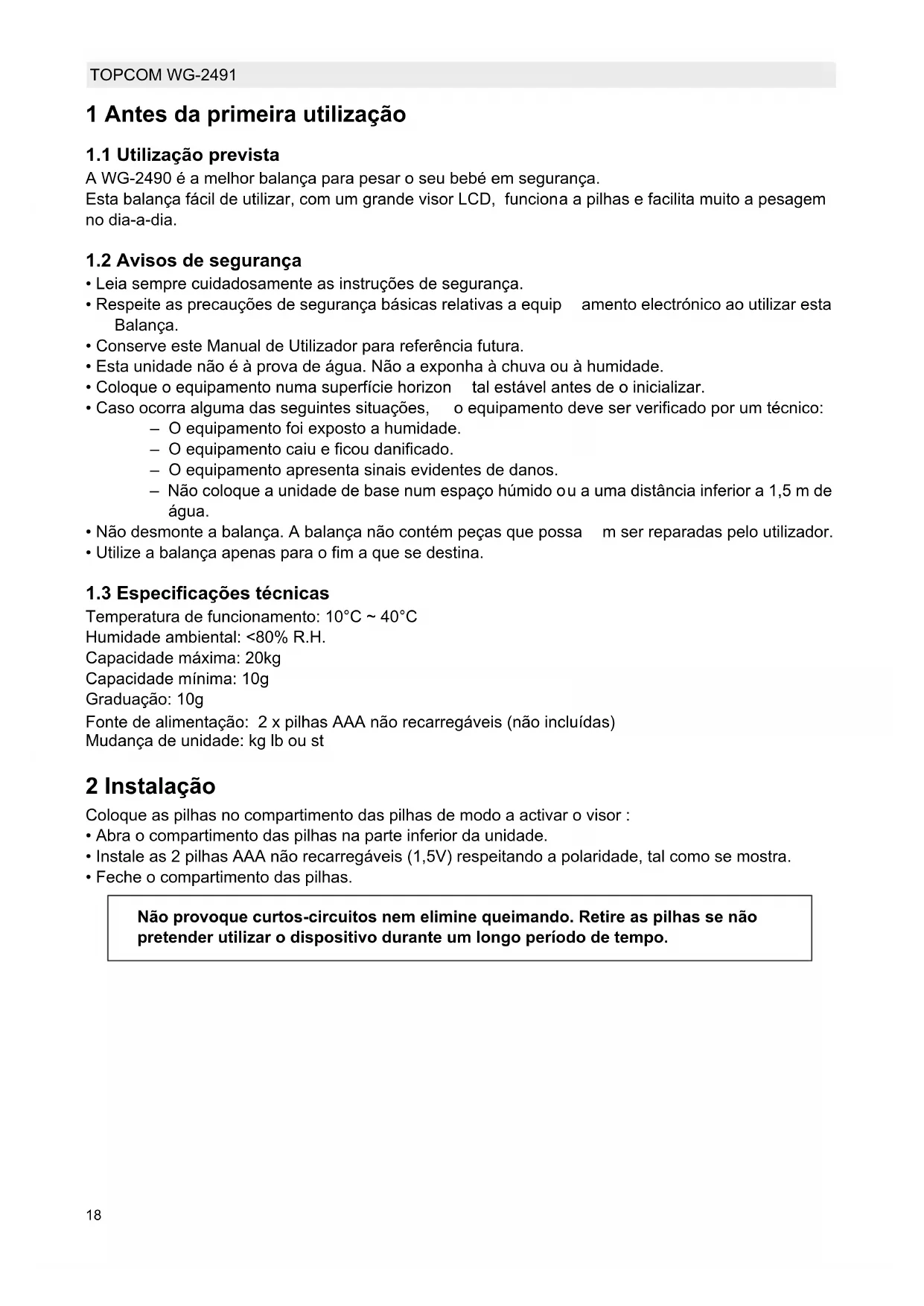 O_ld Corrente fraca - Substitua as pilhas. Sobrecarga. O peso do bebé é superior a 20kg. 6 Limpeza Limpe a balança com um pano ligeiramente humedecido ou com um pano anti-estático. Nunca utilize produtos de limpeza nem solventes abrasivos. 7 Eliminação do dispositivo (ambiente) Quando o ciclo de vida do produto chega ao fim, não deve eliminar este produto juntamente com os resíduos domésticos. Deve levá-lo a um ponto de recolha de equipamentos eléctr icos e electrónicos. O símbolo presente no produto, no manual do utilizador e/ou na caixa dá essa indicação.20 TOPCOM WG-2491 Alguns dos materiais do produto podem ser reutilizados se os colocar num ponto de reciclagem. Ao reutilizar algumas das partes ou das matérias-primas dos produtos utilizados, contribui de forma importante para a protecção do meio ambiente. Contacte as autoridades locais se necessitar de mais informações sobre os pontos de recolha existentes na sua área. As pilhas devem ser removidas antes de eliminar o dispositivo. Elimine as pilhas de forma ecológica, de acordo com os regulamentos do seu país. 8 Garantia da Topcom