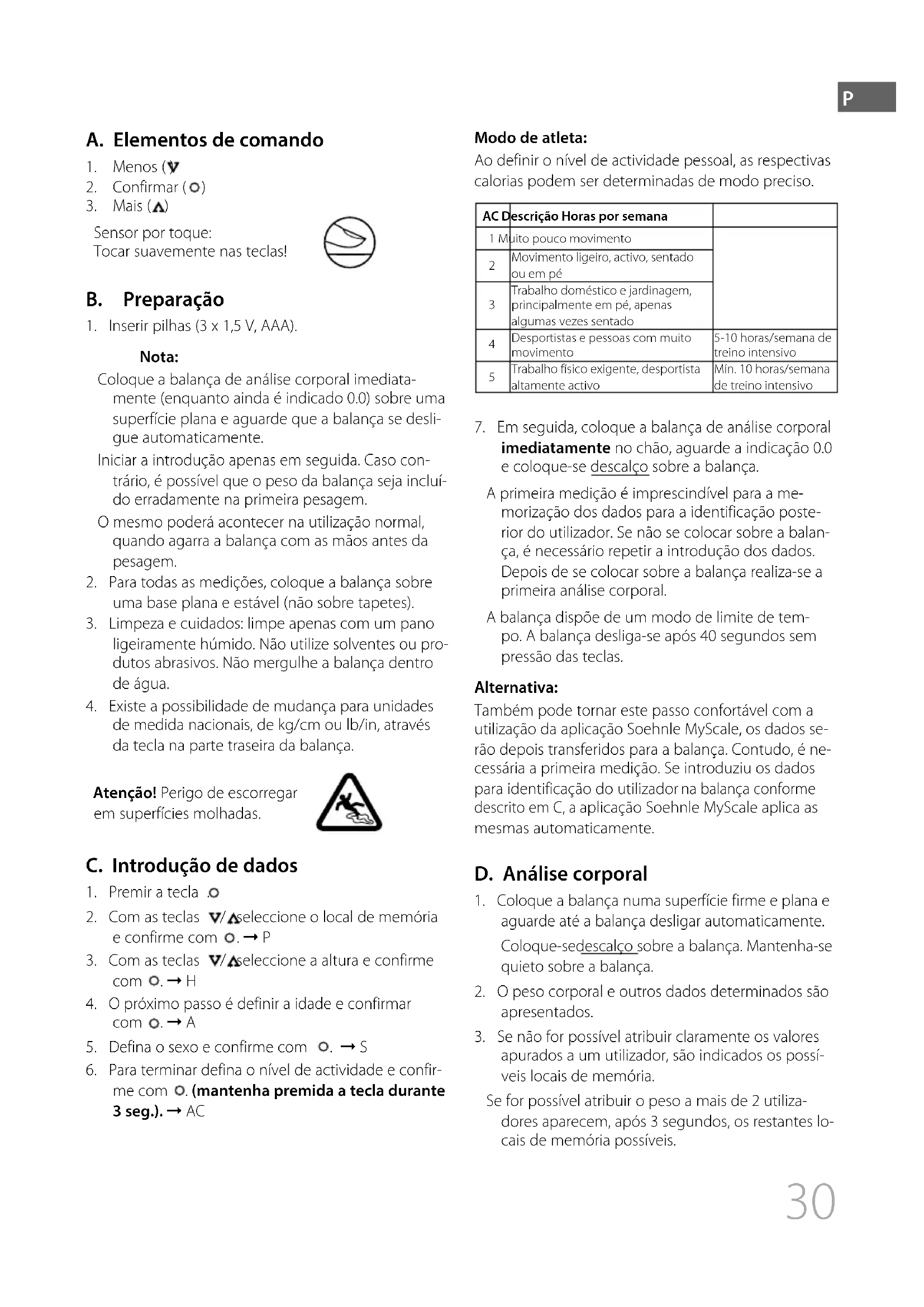 de medida nacionais, de kg/cm ou lb/in, através da tecla na parte traseira da balança. Atenção! Perigo de escorregar em superfícies molhadas. C. Introdução de dados