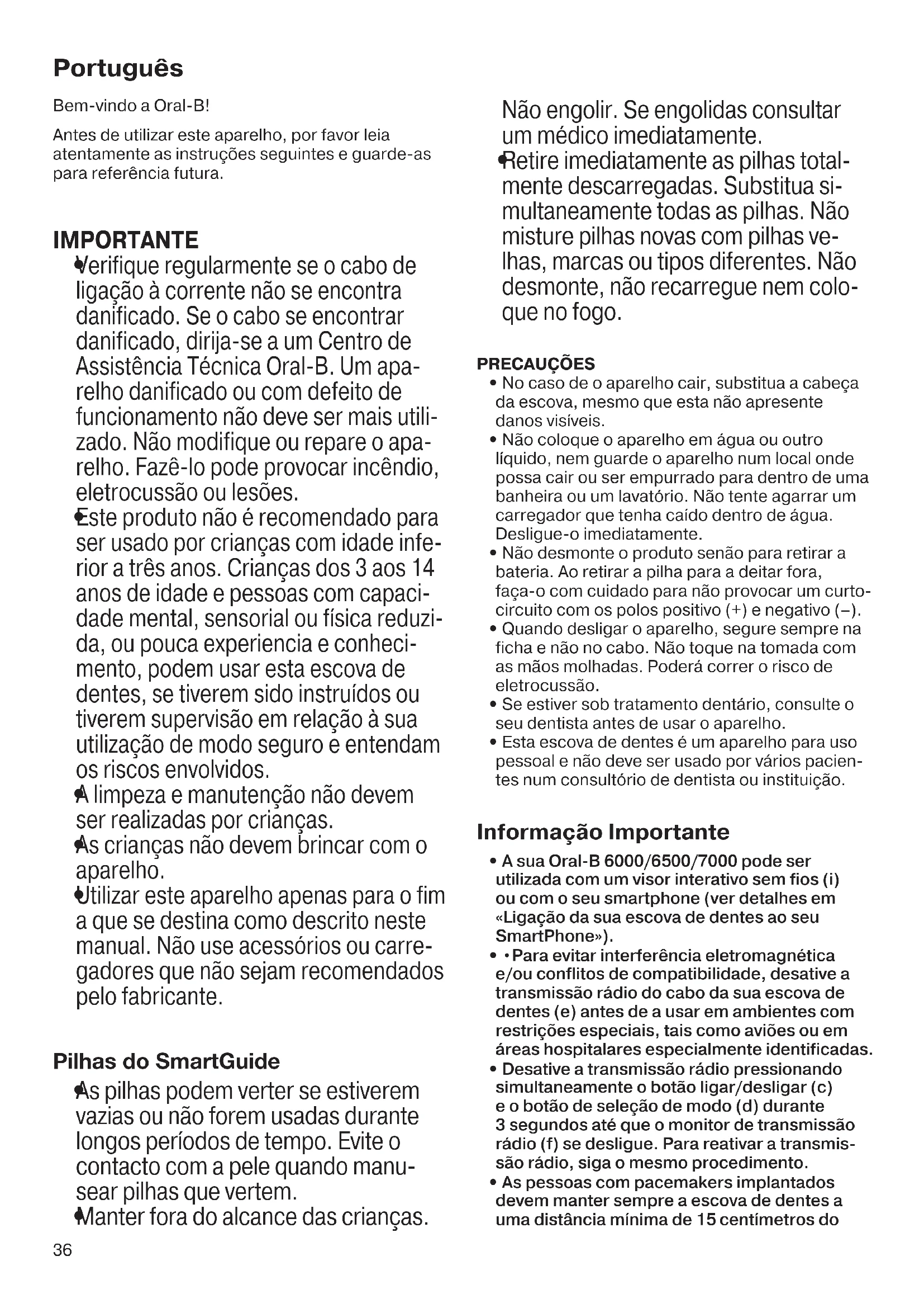 (o superior) para conectar con el cepillo 96507503_D36_WE_S6-92.indd 35 08.01.14 08:1836 Bem-vindo a Oral-B! Antes de utilizar este aparelho, por favor leia atentamente as instruções seguintes e guarde-as para referência futura. IMPORTANTE