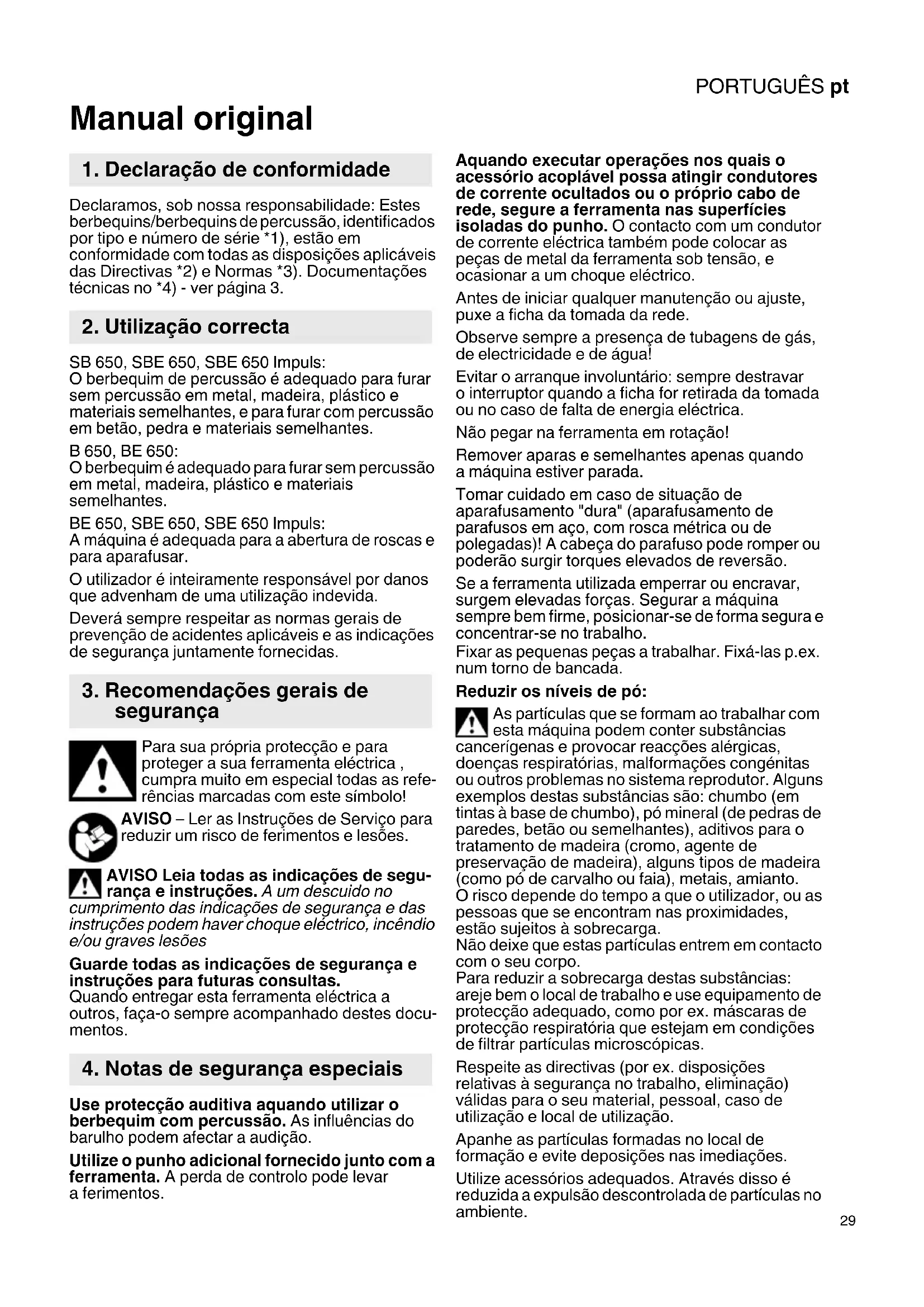Manual original Declaramos, sob nossa responsabilidade: Estes berbequins/berbequins de percussão, identificados por tipo e número de série *1), estão em conformidade com todas as disposições aplicáveis das Directivas *2) e Normas *3). Documentações técnicas no *4) - ver página 3. SB 650, SBE 650, SBE 650 Impuls: O berbequim de percussão é adequado para furar sem percussão em metal, madeira, plástico e materiais semelhantes, e para furar com percussão em betão, pedra e materiais semelhantes. B 650, BE 650: O berbequim é adequado para furar sem percussão em metal, madeira, plástico e materiais semelhantes. BE 650, SBE 650, SBE 650 Impuls: A máquina é adequada para a abertura de roscas e para aparafusar. O utilizador é inteiramente responsável por danos que advenham de uma utilização indevida. Deverá sempre respeitar as normas gerais de prevenção de acidentes aplicáveis e as indicações de segurança juntamente fornecidas. Para sua própria protecção e para proteger a sua ferramenta eléctrica , cumpra muito em especial todas as refe- rências marcadas com este símbolo! AVISO – Ler as Instruções de Serviço para reduzir um risco de ferimentos e lesões. AVISO Leia todas as indicações de segu- rança e instruções. A um descuido no cumprimento das indicações de segurança e das instruções podem haver choque eléctrico, incêndio e/ou graves lesões Guarde todas as indicações de segurança e instruções para futuras consultas. Quando entregar esta ferramenta eléctrica a outros, faça-o sempre acompanhado destes docu- mentos. Use protecção auditiva aquando utilizar o berbequim com percussão. As influências do barulho podem afectar a audição. Utilize o punho adicional fornecido junto com a ferramenta. A perda de controlo pode levar a ferimentos. Aquando executar operações nos quais o acessório acoplável possa atingir condutores de corrente ocultados ou o próprio cabo de rede, segure a ferramenta nas superfícies isoladas do punho. O contacto com um condutor de corrente eléctrica também pode colocar as peças de metal da ferramenta sob tensão, e ocasionar a um choque eléctrico. Antes de iniciar qualquer manutenção ou ajuste, puxe a ficha da tomada da rede. Observe sempre a presença de tubagens de gás, de electricidade e de água! Evitar o arranque involuntário: sempre destravar o interruptor quando a ficha for retirada da tomada ou no caso de falta de energia eléctrica. Não pegar na ferramenta em rotação! Remover aparas e semelhantes apenas quando a máquina estiver parada. Tomar cuidado em caso de situação de aparafusamento "dura" (aparafusamento de parafusos em aço, com rosca métrica ou de polegadas)! A cabeça do parafuso pode romper ou poderão surgir torques elevados de reversão. Se a ferramenta utilizada emperrar ou encravar, surgem elevadas forças. Segurar a máquina sempre bem firme, posicionar-se de forma segura e concentrar-se no trabalho. Fixar as pequenas peças a trabalhar. Fixá-las p.ex. num torno de bancada. Reduzir os níveis de pó: As partículas que se formam ao trabalhar com esta máquina podem conter substâncias cancerígenas e provocar reacções alérgicas, doenças respiratórias, malformações congénitas ou outros problemas no sistema reprodutor. Alguns exemplos destas substâncias são: chumbo (em tintas à base de chumbo), pó mineral (de pedras de paredes, betão ou semelhantes), aditivos para o tratamento de madeira (cromo, agente de preservação de madeira), alguns tipos de madeira (como pó de carvalho ou faia), metais, amianto. O risco depende do tempo a que o utilizador, ou as