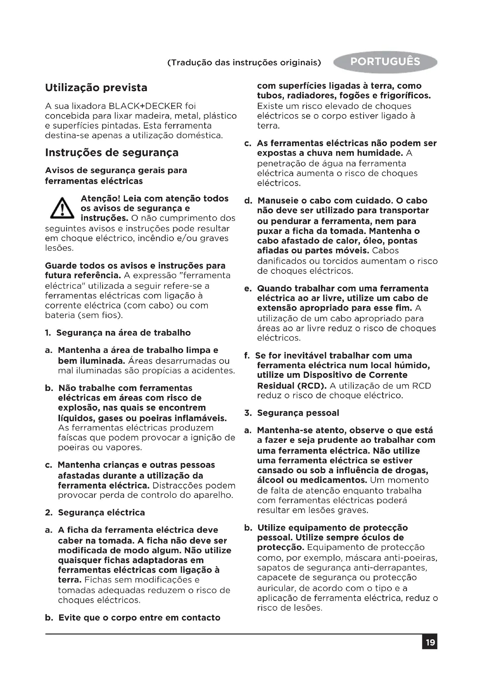 a. A ficha da ferramenta eléctrica deve caber na tomada. A ficha não deve ser modificada de modo algum. Não utilize quaisquer fichas adaptadoras em ferramentas eléctricas com ligação à terra. Fichas sem modificações e tomadas adequadas reduzem o risco de choques eléctricos. b. Evite que o corpo entre em contacto com superfícies ligadas à terra, como tubos, radiadores, fogões e frigoríficos. Existe um risco elevado de choques eléctricos se o corpo estiver ligado à terra. c. As ferramentas eléctricas não podem ser expostas a chuva nem humidade. A penetração de água na ferramenta eléctrica aumenta o risco de choques eléctricos. d. Manuseie o cabo com cuidado. O cabo não deve ser utilizado para transportar ou pendurar a ferramenta, nem para puxar a ficha da tomada. Mantenha o cabo afastado de calor, óleo, pontas afiadas ou partes móveis. Cabos danificados ou torcidos aumentam o risco de choques eléctricos. e. Quando trabalhar com uma ferramenta eléctrica ao ar livre, utilize um cabo de extensão apropriado para esse fim. A utilização de um cabo apropriado para áreas ao ar livre reduz o risco de choques eléctricos. f. Se for inevitável trabalhar com uma ferramenta eléctrica num local húmido, utilize um Dispositivo de Corrente Residual (RCD). A utilização de um RCD reduz o risco de choque eléctrico.