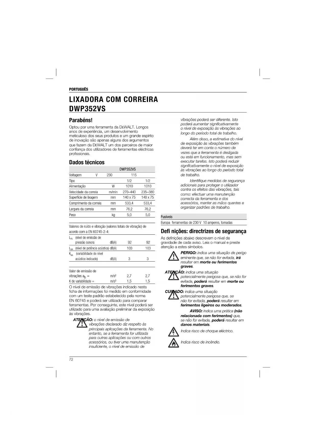 EWALT, a utilização de outros acessórios com esta ferramenta poderá ser perigosa. Para reduzir o risco de ferimentos, apenas deverão ser utilizados acessórios recomendados pela DEWALT com este produto. Consulte o seu revendedor para obter mais informações sobre os acessórios apropriados. Proteger o meio ambiente Recolha de lixo selectiva – este produto não deve ser eliminado juntamente com o lixo doméstico normal. Se, um dia, o seu produto da DEWALT tiver de ser substituído ou já não tiver utilidade, não se desfaça do mesmo juntamente com o lixo doméstico. Disponibilize este produto para recolha selectiva. A recolha selectiva de embalagens e produtos usados permite que os materiais sejam reciclados e utilizados novamente. A reutilização de materiais reciclados ajuda a prevenir a poluição ambiental e reduz a procura de matérias-primas. Os regulamentos locais podem especificar a recolha selectiva de produtos eléctricos na sua residência, em centros municipais de resíduos ou através do revendedor que lhe fornecer um novo produto. A DEWALT disponibiliza um serviço de recolha e reciclagem dos respectivos produtos quando estes tiverem atingido o fim da sua vida útil. Para tirar partido deste serviço, entregue o seu produto em qualquer agente de reparação autorizado, o qual procederá à respectiva recolha em nome da DEWALT. Poderá verificar a localização do agente de reparação autorizado mais perto de si contactando o representante local da DEWALT através da morada indicada neste manual. Em alternativa, poderá encontrar na internet (em www.2helpU. com) uma lista dos agentes de reparação autorizados da D EWALT, bem como os dados de contacto completos do nosso serviço pós-venda. MANUTENÇÃO A sua ferramenta eléctrica da DEWALT foi concebida para funcionar durante um longo período de tempo com uma manutenção mínima. Uma utilização continuamente satisfatória depende de uma manutenção apropriada da ferramenta e de uma limpeza regular. ATENÇÃO: para reduzir o risco de ferimentos, desligue a unidade e retire a respectiva ficha da tomada de electricidade antes de instalar e retirar acessórios, ajustar ou alterar a configuração do equipamento ou efectuar reparações. Certifique- se de que o gatilho se encontra na posição de ferramenta desligada. Um accionamento acidental da ferramenta pode causar ferimentos. Lubrifi cação A sua ferramenta eléctrica não necessita de lubrificação adicional. Limpeza ATENÇÃO: retire os detritos e as partículas da caixa da unidade com ar comprimido seco sempre que houver uma acumulação de detritos dentro das aberturas de ventilação e à volta das mesmas. Use uma protecção ocular e uma máscara contra o pó aprovadas ao efectuar este procedimento. ATENÇÃO: nunca utilize dissolventes ou outros químicos abrasivos para limpar as peças não metálicas da ferramenta. Estes químicos poderão enfraquecer os materiais utilizados nestas peças. Utilize um pano humedecido apenas com água e sabão suave. Nunca deixe entrar qualquer líquido para dentro da ferramenta. Da mesma forma, nunca mergulhe qualquer peça da ferramenta num líquido. Acessórios opcionais ATENÇÃO: uma vez que apenas foram testados com este produto os acessórios disponibilizados pela81 SUOMI pitämällä työkalu ja sen varusteet kunnossa, pitämällä kädet lämpiminä ja kiinnittämällä huomiota työn jaksottamiseen. Sulakkeet Eurooppa 230 voltin työkalut 10 ampeerin sulake Määritelmät: Turvallisuusohjeet Alla näkyvät selitykset liittyvät turvallisuuteen. Lue käyttöohje ja kiinnitä huomiota näihin symboleihin. VAARA: Ilmaisee, että on olemassa hengen- tai vakavan henkilövahingon vaara. VAROITUS: Ilmoittaa, että on olemassa hengen- tai vakavan vaaran mahdollisuus. HUOMIO: Tarkoittaa mahdollista vaaratilannetta. Ellei tilannetta korjata, saattaa aiheutua lievä tai keskinkertainen loukkaantuminen. HUOMAUTUS: Viittaa menettelyyn, joka ei välttämättä aiheuta henkilövahinkoa mutta voi aiheuttaa omaisuusvahingon. Sähköiskun vaara! Tulipalon vaara. EU-yhdenmukaisuusilmoitus KONEDIREKTIIVI NAUHAHIOMAKONE DWP352VS DEWALT vakuuttaa, että nämä tuotteet täyttävät seuraavat määräykset: 2006/42/EU, EN 60745-1, EN 60745-2-4. Nämä tuotteet täyttävät direktiivin 2004/108/EY (19.04.2016 saakka), 2014/30/EY (20.04.2016 lähtien) ja 2011/65/EY vaatimukset. Saat lisätietoja ottamalla yhteyden DEWALTiin. Osoitteet näkyvät käyttöohjeen takasivulla. Allekirjoittaja vastaa Teknisistä tiedoista ja antaa tämän vakuutuksen D EWALTin puolesta. Onnittelut! Olet valinnut DEWALT-työkalun. Monien vuosien kokemus, huolellinen tuotekehitys ja innovaatiot tekevät DEWALT-työkaluista luotettavia kumppaneita ammattilaisille. Tekniset tiedot DWP352VS Jännite V 230 115 Tyyppi 1/2 1/2 Virransyöttö W 1010 1010 Nauhan nopeus m/min 270–440 235–380 Hiomapinta mm 140 x 75 140 x 75 Nauhan pituus mm 533,4 533,4 Nauhan leveys mm 76,2 76,2 Paino kg 5,0 5,0 Ääni- ja tärinäarvot (triaksiaalinen vektorisumma) standardin EN60745-2-4 mukaisesti: