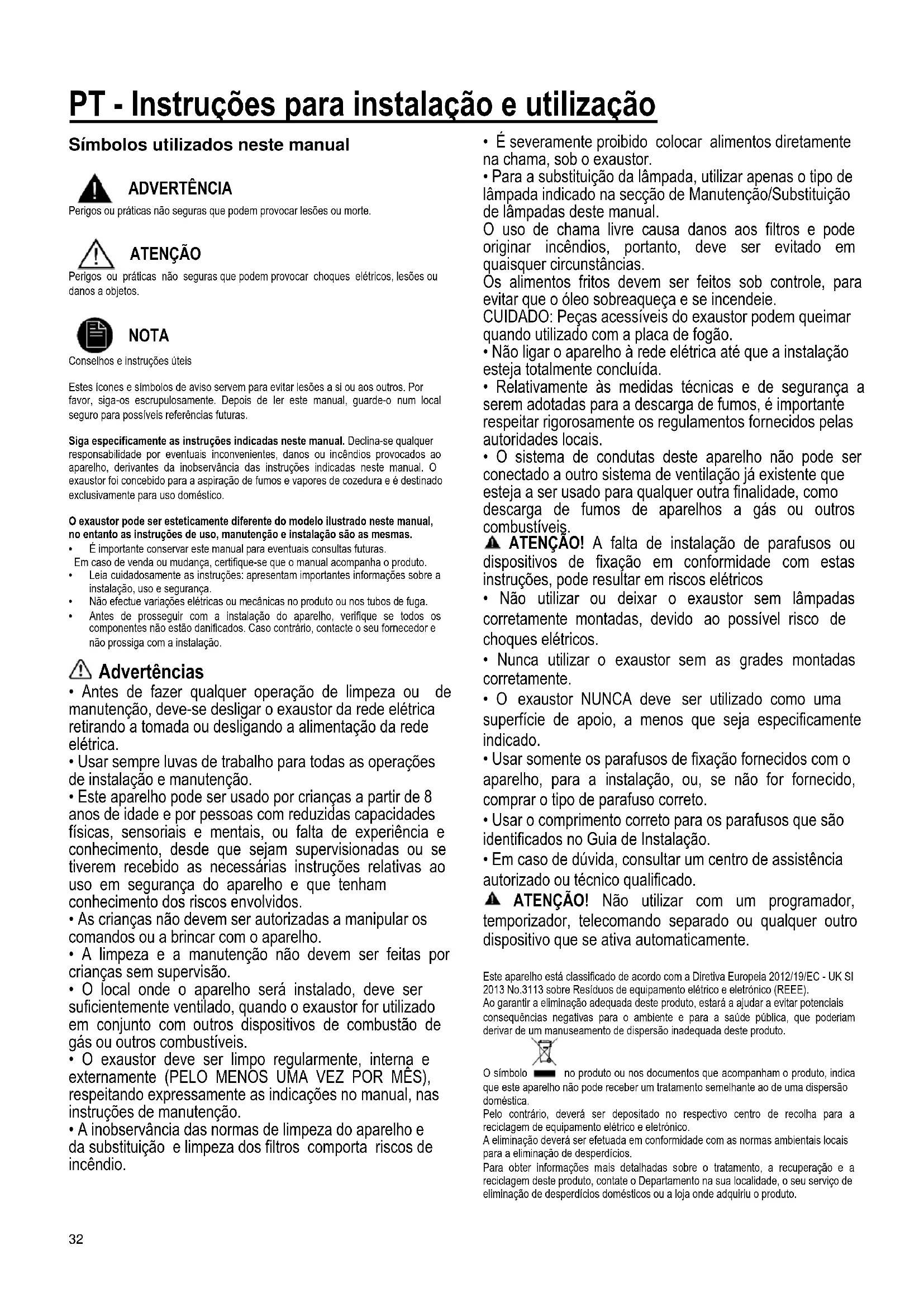 NOTA Conselhos e instruções úteis Estes ícones e símbolos de aviso servem para evitar lesões a si ou aos outros. Por favor, siga-os escrupulosamente. Depois de ler este manual, guarde-o num local seguro para possíveis referências futuras. Siga especificamente as instruções indicadas neste manual. Declina-se qualquer responsabilidade por eventuais inconvenientes, danos ou incêndios provocados ao aparelho, derivantes da inobservância das instruções indicadas neste manual. O exaustor foi concebido para a aspiração de fumos e vapores de cozedura e é destinado exclusivamente para uso doméstico. O exaustor pode ser esteticamente diferente do modelo ilustrado neste manual, no entanto as instruções de uso, manutenção e instalação são as mesmas.