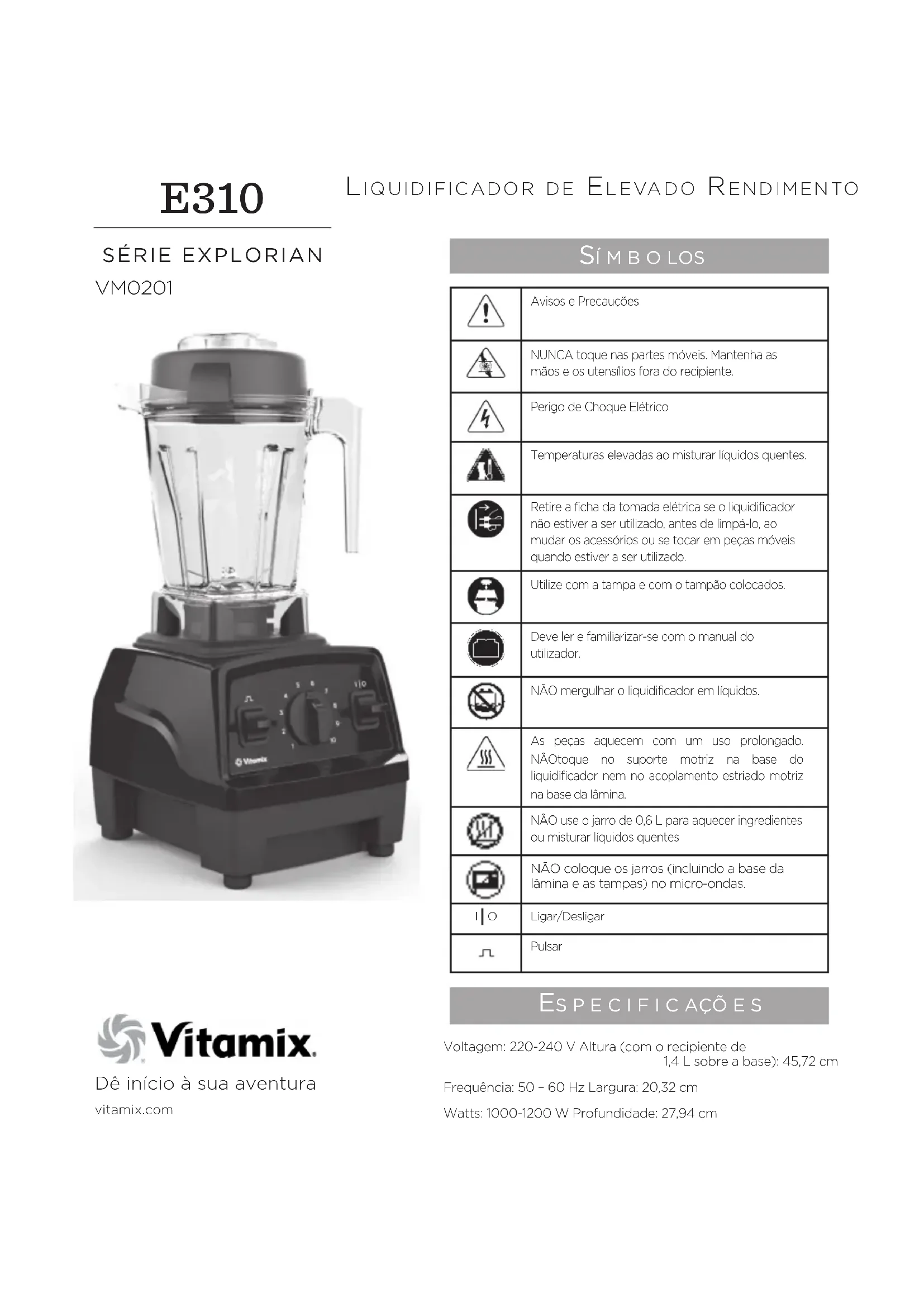 Encontre gratuitamente o manual do aparelho Explorian E310 Vitamix em formato PDF.