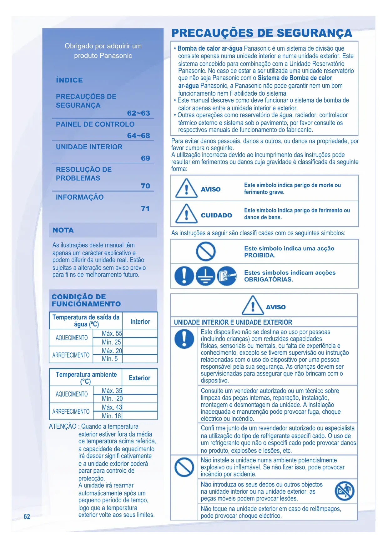 FUNCIONAMENTO FUNCIONAMENTO Temperatura de saída da água (ºC) Interior AQUECIMENTO Máx. 55 Mín. 25 ARREFECIMENTO Máx. 20 Mín. 5 Temperatura ambiente (°C) Exterior AQUECIMENTO Máx. 35 Mín. -20 ARREFECIMENTO Máx. 43 Mín. 16 ATENÇÃO : Quando a temperatura exterior estiver fora da média de temperatura acima referida, a capacidade de aquecimento irá descer signifi cativamente e a unidade exterior poderá parar para controlo de protecção. A unidade irá rearmar automaticamente após um pequeno período de tempo, logo que a temperatura exterior volte aos seus limites. Para evitar danos pessoais, danos a outros, ou danos na propriedade, por favor cumpra o seguinte. A utilização incorrecta devido ao incumprimento das instruções pode resultar em ferimentos ou danos cuja gravidade é classifi cada da seguinte forma: AVISO AVISO Este símbolo indica perigo de morte ou ferimento grave. CUIDADO CUIDADO Este símbolo indica perigo de ferimento ou danos de bens. As instruções a seguir são classifi cadas com os seguintes símbolos: Este símbolo indica uma acção PROIBIDA. Estes símbolos indicam acções OBRIGATÓRIAS. AVISO AVISO