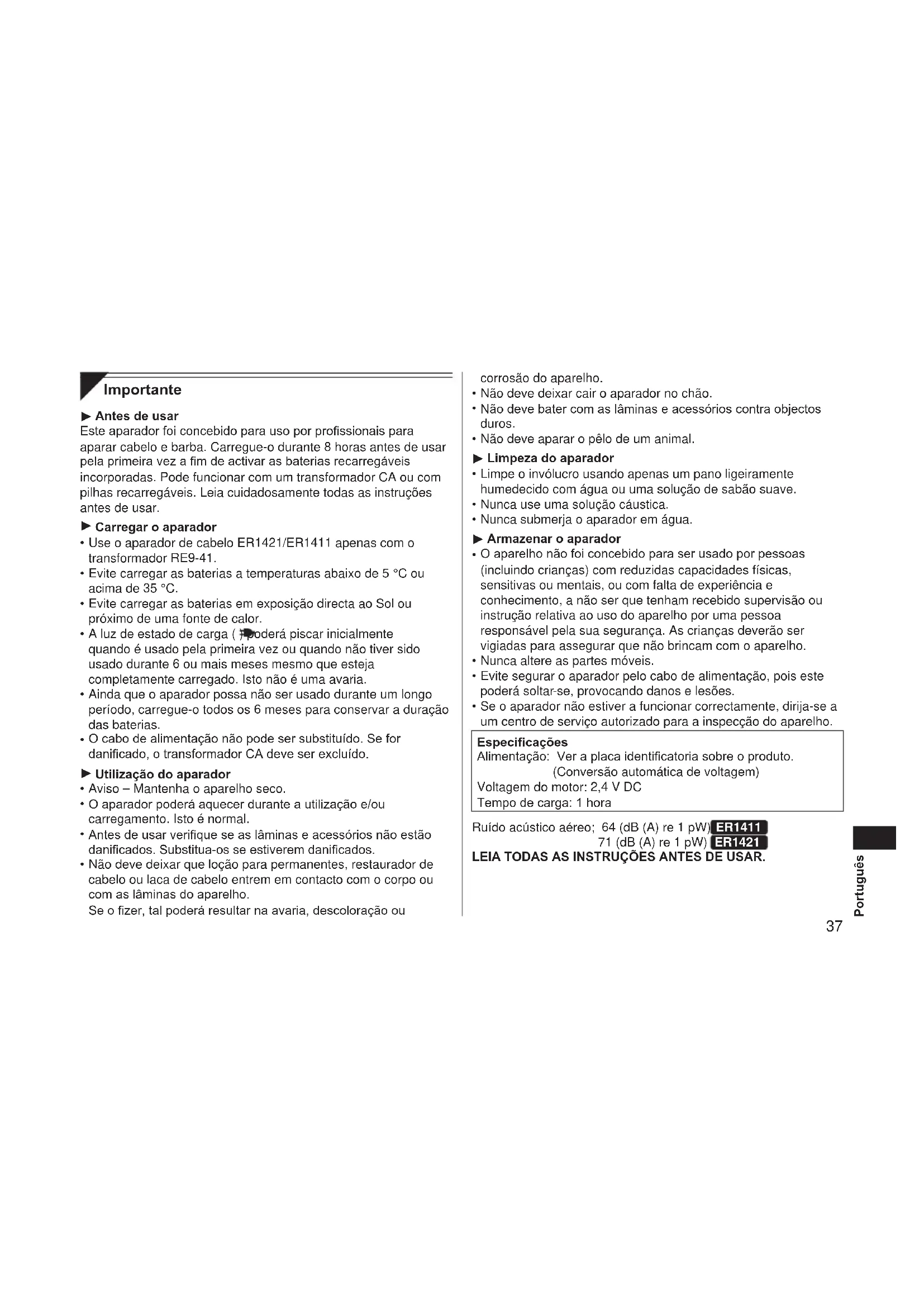 corrosão do aparelho. Não deve deixar cair o aparador no chão. Não deve bater com as lâminas e acessórios contra objectos duros. Não deve aparar o pêlo de um animal. Limpeza do aparador Limpe o invólucro usando apenas um pano ligeiramente humedecido com água ou uma solução de sabão suave. Nunca use uma solução cáustica. Nunca submerja o aparador em água. Armazenar o aparador O aparelho não foi concebido para ser usado por pessoas (incluindo crianças) com reduzidas capacidades físicas, sensitivas ou mentais, ou com falta de experiência e conhecimento, a não ser que tenham recebido supervisão ou instrução relativa ao uso do aparelho por uma pessoa responsável pela sua segurança. As crianças deverão ser vigiadas para assegurar que não brincam com o aparelho. Nunca altere as partes móveis. Evite segurar o aparador pelo cabo de alimentação, pois este poderá soltar ‑se, provocando danos e lesões. Se o aparador não estiver a funcionar correctamente, dirija‑se a um centro de serviço autorizado para a inspecção do aparelho. Especicações Alimentação: Ver a placa identicatoria sobre o produto. (Conversão automática de voltagem) Voltagem do motor: 2,4 V DC Tempo de carga: 1 hora Ruído acústico aéreo; 64 (dB (A) re 1 pW) ER1411 71 (dB (A) re 1 pW) ER1421 LEIA TODAS AS INSTRUÇÕES ANTES DE USAR.