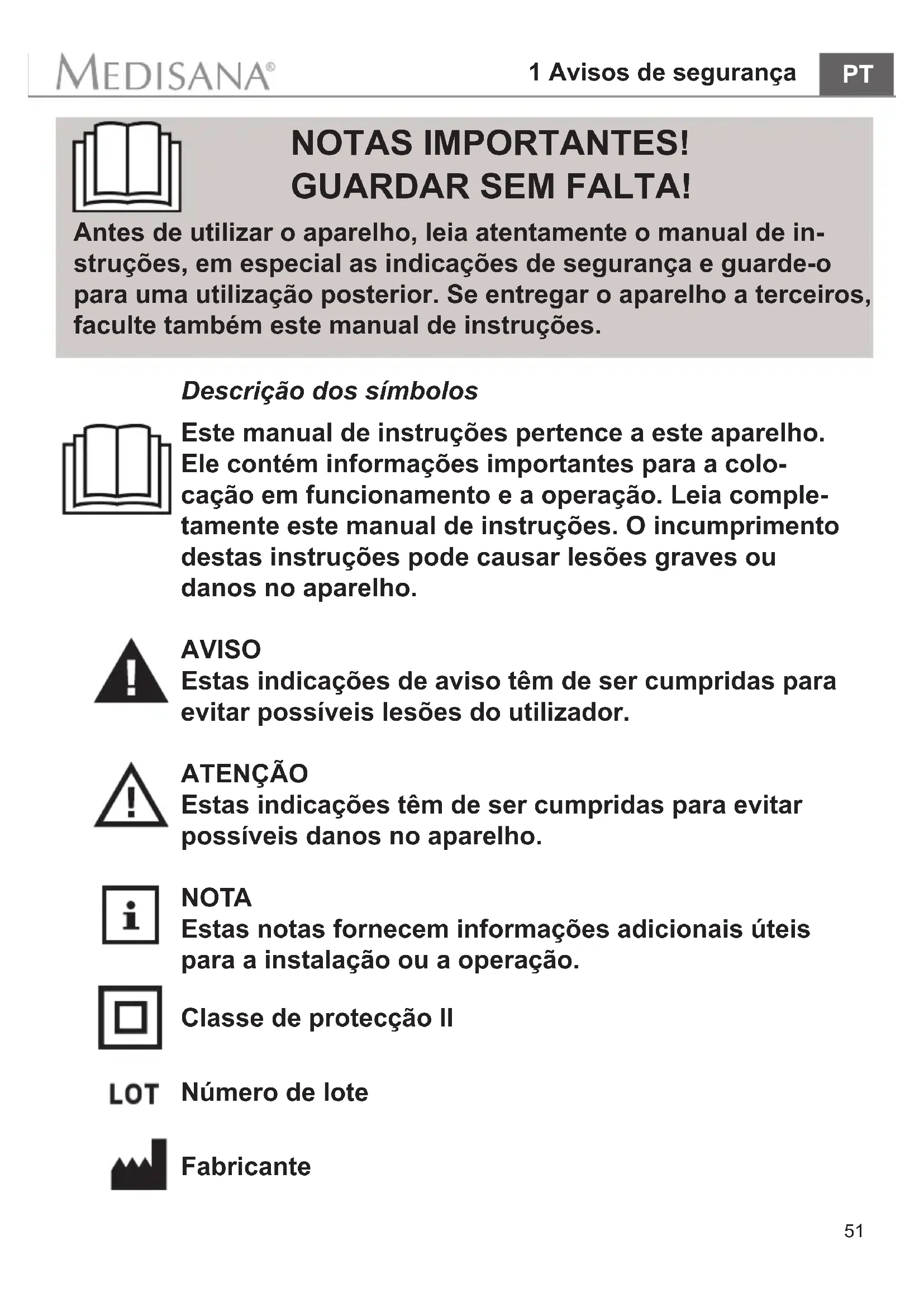 Classe de protecção II Número de lote Fabricante 1 Avisos de segurança NOTAS IMPORTANTES! GUARDAR SEM FALTA! Antes de utilizar o aparelho, leia atentamente o manual de in- struções, em especial as indicações de segurança e guarde-o para uma utilização posterior. Se entregar o aparelho a terceiros, faculte também este manual de instruções. Descrição dos símbolos Este manual de instruções pertence a este aparelho. Ele contém informações importantes para a colo- cação em funcionamento e a operação. Leia comple- tamente este manual de instruções. O incumprimento destas instruções pode causar lesões graves ou danos no aparelho. AVISO Estas indicações de aviso têm de ser cumpridas para evitar possíveis lesões do utilizador. ATENÇÃO Estas indicações têm de ser cumpridas para evitar possíveis danos no aparelho. NOTA Estas notas fornecem informações adicionais úteis para a instalação ou a operação.52 1 Avisos de segurança