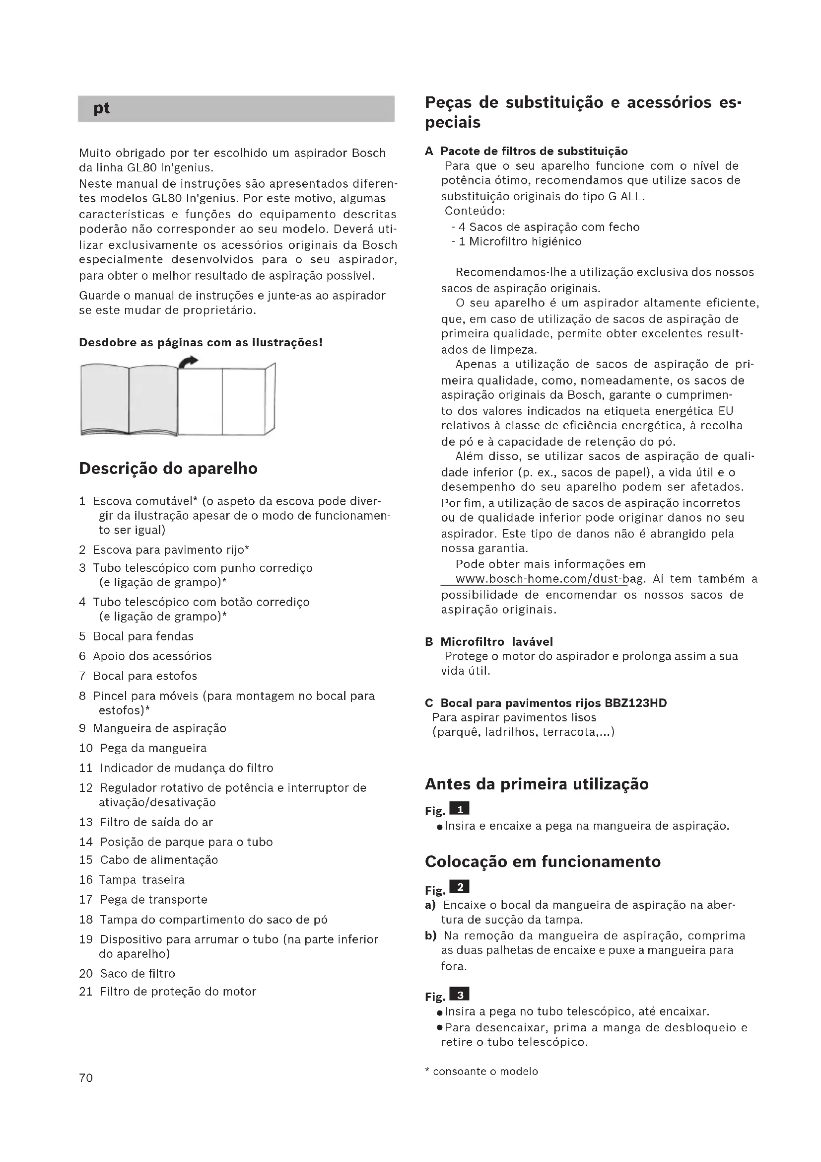 Muito obrigado por ter escolhido um aspirador Bosch da linha GL80 In'genius. Neste manual de instruções são apresentados diferen- tes modelos GL80 In'genius. Por este motivo, algumas características e funções do equipamento descritas poderão não corresponder ao seu modelo. Deverá uti- lizar exclusivamente os acessórios originais da Bosch especialmente desenvolvidos para o seu aspirador, para obter o melhor resultado de aspiração possível. Guarde o manual de instruções e junte-as ao aspirador se este mudar de proprietário. Desdobre as páginas com as ilustrações! Descrição do aparelho 1 Escova comutável* (o aspeto da escova pode diver- gir da ilustração apesar de o modo de funcionamen- to ser igual) 2 Escova para pavimento rijo* 3 Tubo telescópico com punho corrediço (e ligação de grampo)* 4 Tubo telescópico com botão corrediço (e ligação de grampo)* 5 Bocal para fendas 6 Apoio dos acessórios 7 Bocal para estofos 8 Pincel para móveis (para montagem no bocal para estofos)* 9 Mangueira de aspiração 10 Pega da mangueira 11 Indicador de mudança do filtro 12 Regulador rotativo de potência e interruptor de ativação/desativação 13 Filtro de saída do ar 14 Posição de parque para o tubo 15 Cabo de alimentação 16 Tampa traseira 17 Pega de transporte 18 Tampa do compartimento do saco de pó 19 Dispositivo para arrumar o tubo (na parte inferior do aparelho) 20 Saco de filtro 21 Filtro de proteção do motor