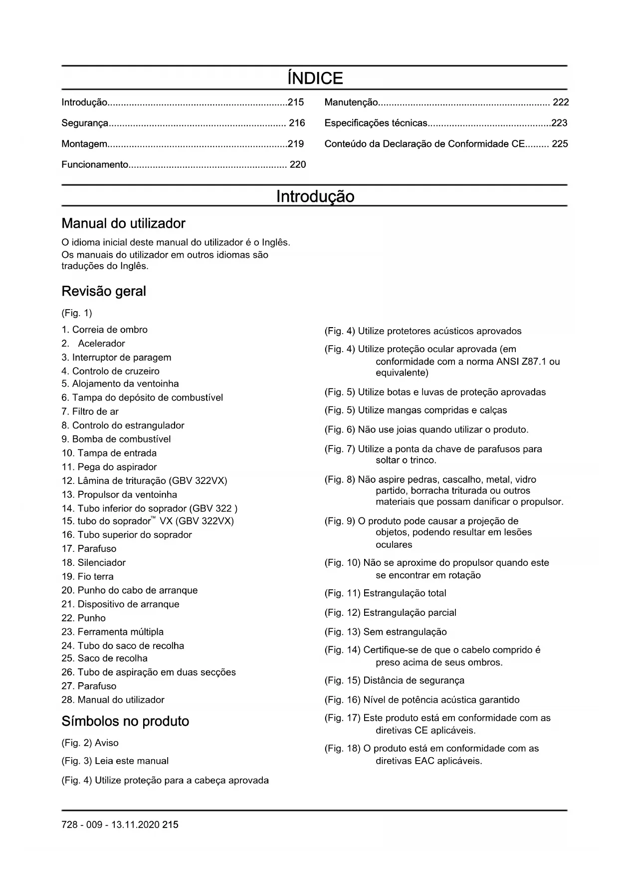 - Conteúdo da Declaração de Conformidade CE Introdução Manual do utilizador O idioma inicial deste manual do utilizador é o Inglês. Os manuais do utilizador em outros idiomas são traduções do Inglês. Revisão geral (Fig. 1) p. 225