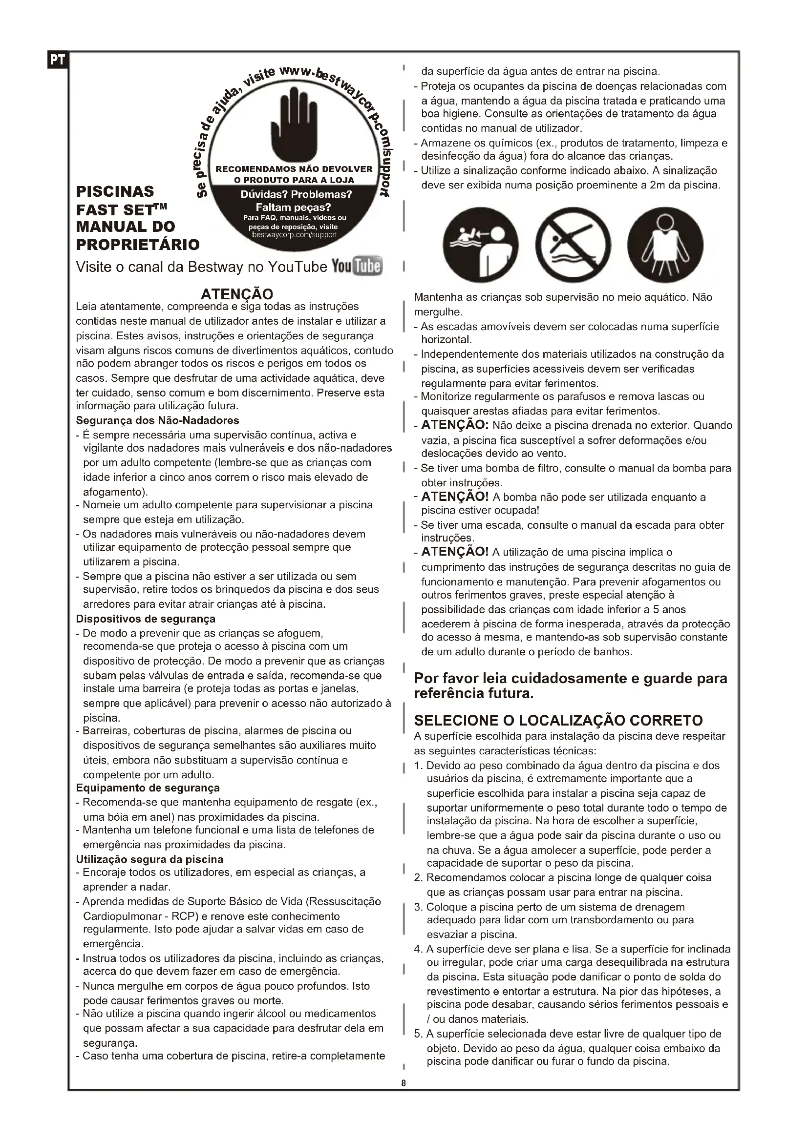 ATENÇÃO Leia atentamente, compreenda e siga todas as instruções contidas neste manual de utilizador antes de instalar e utilizar a piscina. Estes avisos, instruções e orientações de segurança visam alguns riscos comuns de divertimentos aquáticos, contudo não podem abranger todos os riscos e perigos em todos os casos. Sempre que desfrutar de uma actividade aquática, deve ter cuidado, senso comum e bom discernimento. Preserve esta informação para utilização futura.Segurança dos Não-Nadadores- É sempre necessária uma supervisão contínua, activa e vigilante dos nadadores mais vulneráveis e dos não-nadadores por um adulto competente (lembre-se que as crianças com idade inferior a cinco anos correm o risco mais elevado de afogamento).- Nomeie um adulto competente para supervisionar a piscina sempre que esteja em utilização.- Os nadadores mais vulneráveis ou não-nadadores devem utilizar equipamento de protecção pessoal sempre que utilizarem a piscina.- Sempre que a piscina não estiver a ser utilizada ou sem supervisão, retire todos os brinquedos da piscina e dos seus arredores para evitar atrair crianças até à piscina.Dispositivos de segurança- De modo a prevenir que as crianças se afoguem, recomenda-se que proteja o acesso à piscina com um dispositivo de protecção. De modo a prevenir que as crianças subam pelas válvulas de entrada e saída, recomenda-se que instale uma barreira (e proteja todas as portas e janelas, sempre que aplicável) para prevenir o acesso não autorizado à piscina.- Barreiras, coberturas de piscina, alarmes de piscina ou dispositivos de segurança semelhantes são auxiliares muito úteis, embora não substituam a supervisão contínua e competente por um adulto.Equipamento de segurança- Recomenda-se que mantenha equipamento de resgate (ex., uma bóia em anel) nas proximidades da piscina.- Mantenha um telefone funcional e uma lista de telefones de emergência nas proximidades da piscina.Utilização segura da piscina- Encoraje todos os utilizadores, em especial as crianças, a aprender a nadar.- Aprenda medidas de Suporte Básico de Vida (Ressuscitação Cardiopulmonar - RCP) e renove este conhecimento regularmente. Isto pode ajudar a salvar vidas em caso de emergência.- Instrua todos os utilizadores da piscina, incluindo as crianças, acerca do que devem fazer em caso de emergência.- Nunca mergulhe em corpos de água pouco profundos. Isto pode causar ferimentos graves ou morte.- Não utilize a piscina quando ingerir álcool ou medicamentos que possam afectar a sua capacidade para desfrutar dela em segurança.- Caso tenha uma cobertura de piscina, retire-a completamente da superfície da água antes de entrar na piscina. - Proteja os ocupantes da piscina de doenças relacionadas com a água, mantendo a água da piscina tratada e praticando uma boa higiene. Consulte as orientações de tratamento da água contidas no manual de utilizador.- Armazene os químicos (ex., produtos de tratamento, limpeza e desinfecção da água) fora do alcance das crianças.- Utilize a sinalização conforme indicado abaixo. A sinalização deve ser exibida numa posição proeminente a 2m da piscina.Mantenha as crianças sob supervisão no meio aquático. Não mergulhe.- As escadas amovíveis devem ser colocadas numa superfície horizontal.- Independentemente dos materiais utilizados na construção da piscina, as superfícies acessíveis devem ser verificadas regularmente para evitar ferimentos.- Monitorize regularmente os parafusos e remova lascas ou quaisquer arestas afiadas para evitar ferimentos. ATENÇÃO: Não deixe a piscina drenada no exterior. Quando vazia, a piscina fica susceptível a sofrer deformações e/ou deslocações devido ao vento.- Se tiver uma bomba de filtro, consulte o manual da bomba para obter instruções. ATENÇÃO! A bomba não pode ser utilizada enquanto a piscina estiver ocupada!- Se tiver uma escada, consulte o manual da escada para obter instruções. ATENÇÃO! A utilização de uma piscina implica o cumprimento das instruções de segurança descritas no guia de funcionamento e manutenção. Para prevenir afogamentos ou outros ferimentos graves, preste especial atenção à possibilidade das crianças com idade inferior a 5 anos acederem à piscina de forma inesperada, através da protecção do acesso à mesma, e mantendo-as sob supervisão constante de um adulto durante o período de banhos. Por favor leia cuidadosamente e guarde para referência futura.