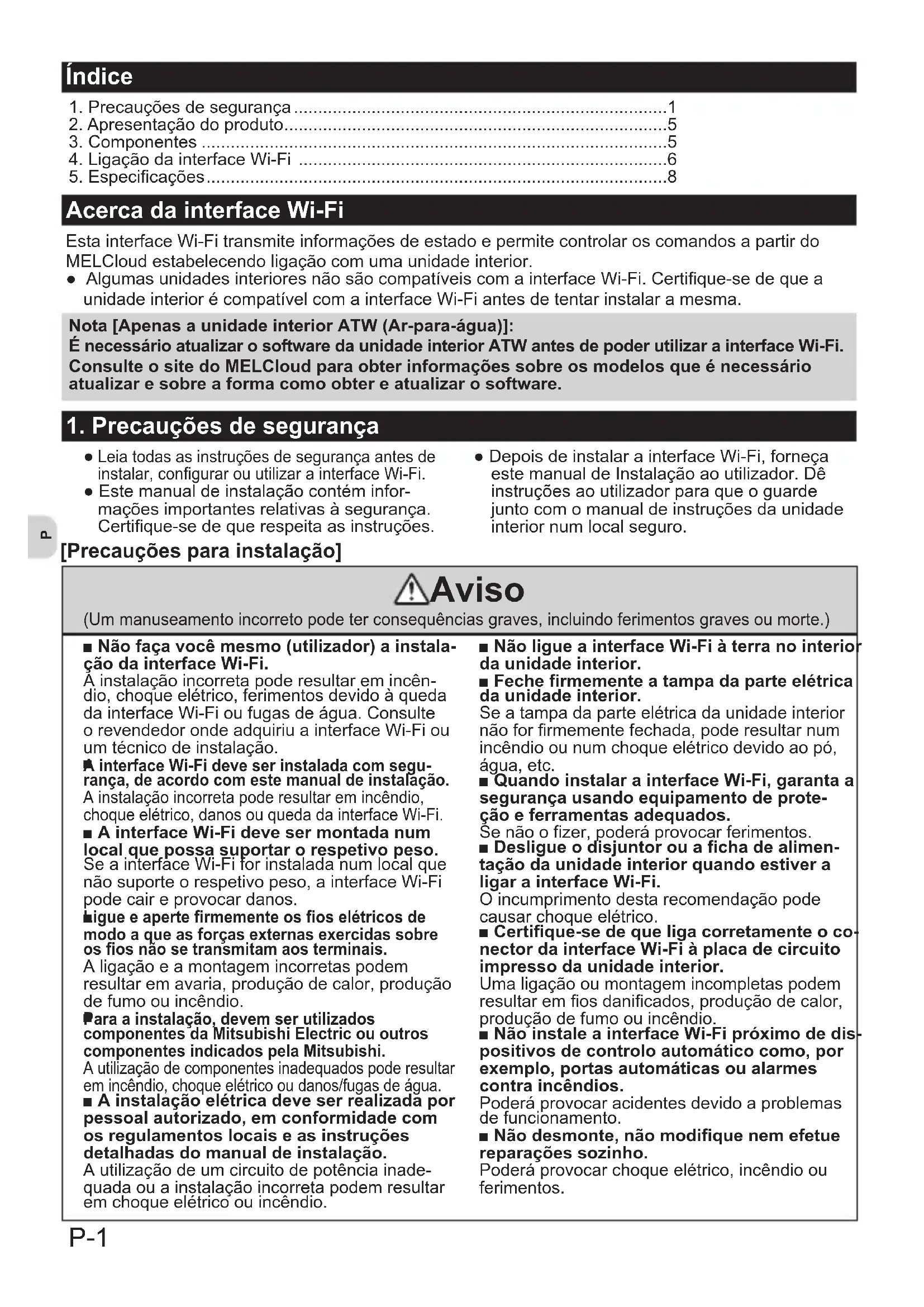 Leia todas as instruções de segurança antes de instalar, congurar ou utilizar a interface Wi-Fi. ● Este manual de instalação contém infor- mações importantes relativas à segurança. Certique-se de que respeita as instruções. ● Depois de instalar a interface Wi-Fi, forneça este manual de Instalação ao utilizador. Dê instruções ao utilizador para que o guarde junto com o manual de instruções da unidade interior num local seguro. Índice Acerca da interface Wi-Fi Esta interface Wi-Fi transmite informações de estado e permite controlar os comandos a partir do MELCloud estabelecendo ligação com uma unidade interior. ● Algumas unidades interiores não são compatíveis com a interface Wi-Fi. Certique-se de que a unidade interior é compatível com a interface Wi-Fi antes de tentar instalar a mesma. [Precauções para instalação] Aviso (Um manuseamento incorreto pode ter consequências graves, incluindo ferimentos graves ou morte.) ■ Não faça você mesmo (utilizador) a instala- ção da interface Wi-Fi. A instalação incorreta pode resultar em incên- dio, choque elétrico, ferimentos devido à queda da interface Wi-Fi ou fugas de água. Consulte o revendedor onde adquiriu a interface Wi-Fi ou um técnico de instalação.