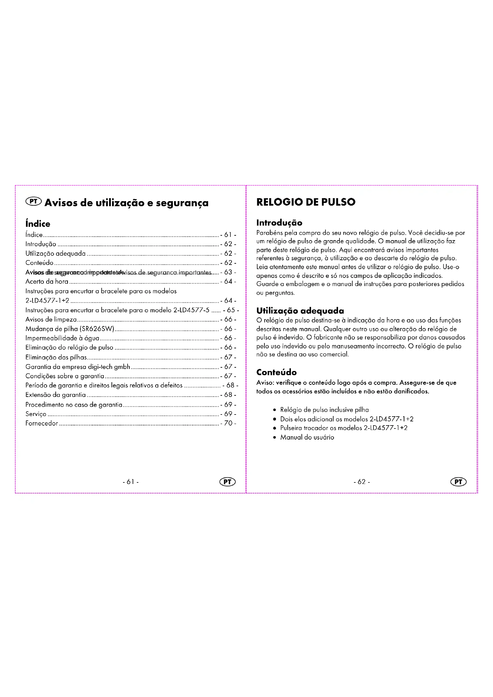 Introdução Parabéns pela compra do seu novo relógio de pulso. Você decidiu-se por um relógio de pulso de grande qualidade. O manual de utilização faz parte deste relógio de pulso. Aqui encontrará avisos importantes referentes à segurança, à utilização e ao descarte do relógio de pulso. Leia atentamente este manual antes de utilizar o relógio de pulso. Use-o apenas como é descrito e só nos campos de aplicação indicados. Guarde a embalagem e o manual de instruções para posteriores pedidos ou perguntas. Utilização adequada O relógio de pulso destina-se à indicação da hora e ao uso das funções descritas neste manual. Qualquer outro uso ou alteração do relógio de pulso é indevido. O fabricante não se responsabiliza por danos causados pelo uso indevido ou pelo manuseamento incorrecto. O relógio de pulso não se destina ao uso comercial. Conteúdo Aviso: verifique o conteúdo logo após a compra. Assegure-se de que todos os acessórios estão incluídos e não estão danificados.