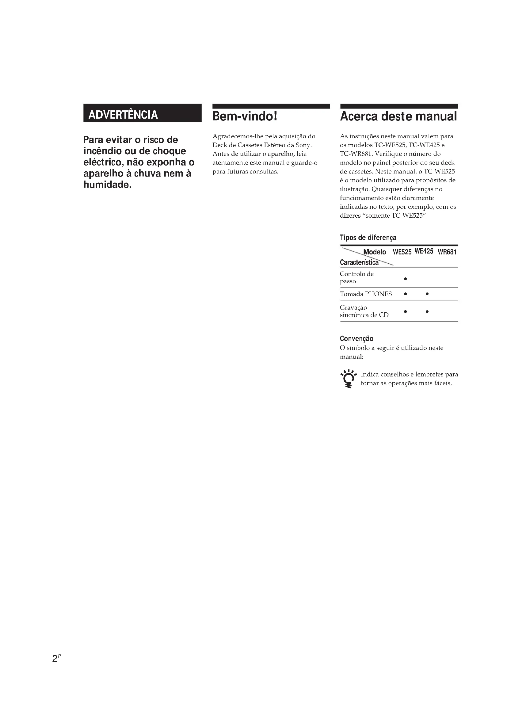 Bem-vindo! Agradecemos-lhe pela aquisição doDeck de Cassetes Estéreo da Sony.Antes de utilizar o aparelho, leiaatentamente este manual e guarde-opara futuras consultas. ADVERTÊNCIA Para evitar o risco de incêndio ou de choque eléctrico, não exponha o aparelho à chuva nem à humidade. Convenção O símbolo a seguir é utilizado nestemanual: Indica conselhos e lembretes paratornar as operações mais fáceis. Modelo Característica WE525