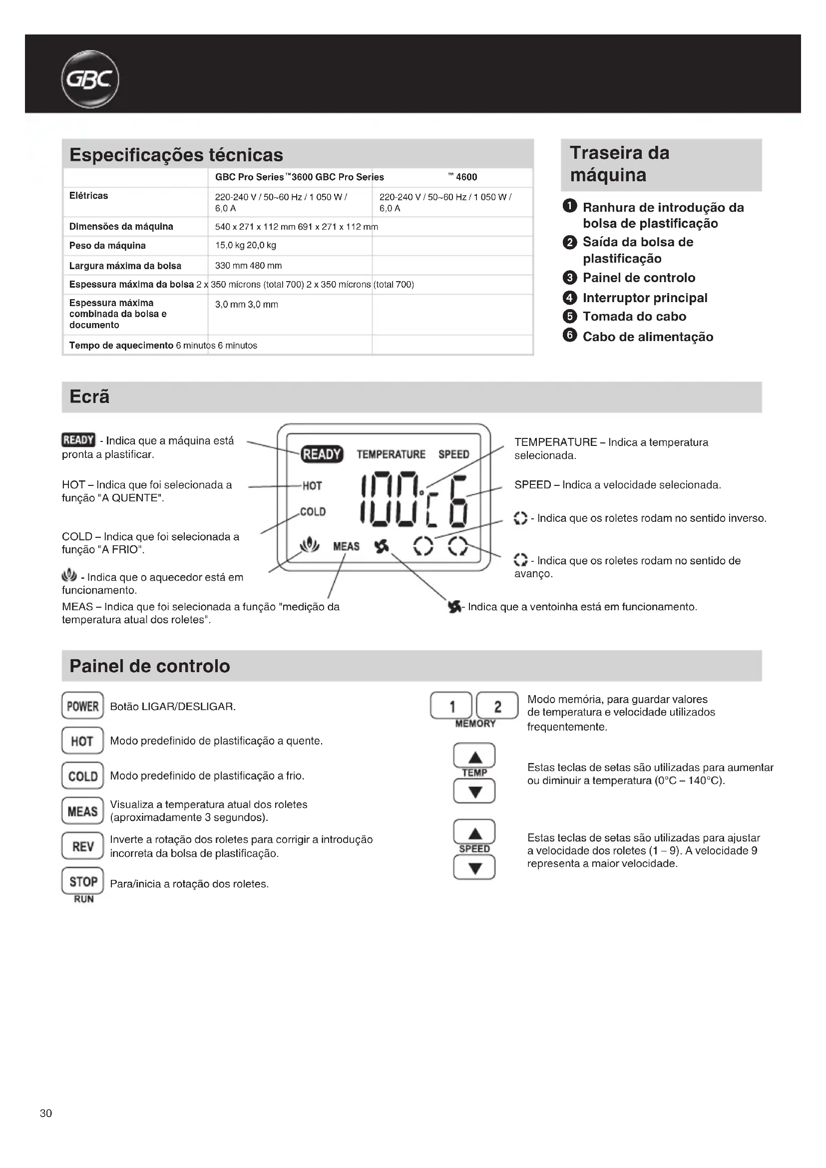 - Não corte as bolsas de plasticação antes de efetuar a plasticação. Guiadeplasticação Tipo de papel Espessura da película Regulação sem porta-bolsas Regulação com porta-bolsas Temperatura Velocidade Temperatura Velocidade Papel de cópia 75-100 mícrons 100°C 6 130°C 4 125-150 mícrons 120°C 4 130°C 3 175-250 mícrons 120°C 3 140°C 2 300-350 mícrons 130°C 2 - - Papel próprio para brochuras 75-100 mícrons 100°C 5 130°C 4 125-150 mícrons 120°C 3 140°C 3 175-250 mícrons 130°C 2 140°C 2 300-350 mícrons 140°C 2 - - Papelfotográco 75-100 mícrons 100°C 4 130°C 3 125-150 mícrons 130°C 3 140°C 2 175-250 mícrons 140°C 2 140°C 1 NOTA: Em modo "STANDBY", mantenha a temperatura a 70°C e a velocidade regulada em 2. Garantia O funcionamento desta máquina está garantido por um período de 1 anos a contar da sua data de compra, em condições normais de utilização. No período de garantia, a Acco Brands Europe efectuará a reparação ou substituição gratuita da máquina defeituosa, segundo o seu critério exclusivo. Os defeitos resultantes de má utilização ou utilização imprópria não estão abrangidos por esta garantia. É necessária a apresentação de prova da data de compra. As reparações ou alterações efectuadas por pessoas não autorizadas pela ACCO Brands Europe anularão esta garantia. Estamos empenhados em assegurar que o desempenho dos nossos produtos está de acordo com as especicações indicadas. Esta garantia não afecta os direitos legais dos consumidores ao abrigo da legislação nacional aplicável que regula a venda de mercadorias. Se ocorrer um problema de natureza técnica com a sua máquina durante o período de garantia, queira contactar o Centro de Assistência Técnica da ACCO relevante. Dependendo do problema identicado e do modelo da máquina, organizaremos a visita de um técnico ou pedir-lhe-emos que devolva a sua máquina à ACCO. Se devolver a máquina, a ACCO procederá, segundo seu critério e em conformidade com a lei, à (i) reparação da máquina usando para tal peças novas ou recondicionadas, ou (ii) substituição da máquina por uma nova ou recondicionada, equivalente à que está a ser substituída. Registe este produto on-line em www.accobrands.com34 Teknik Özellikler GBC Pro Series