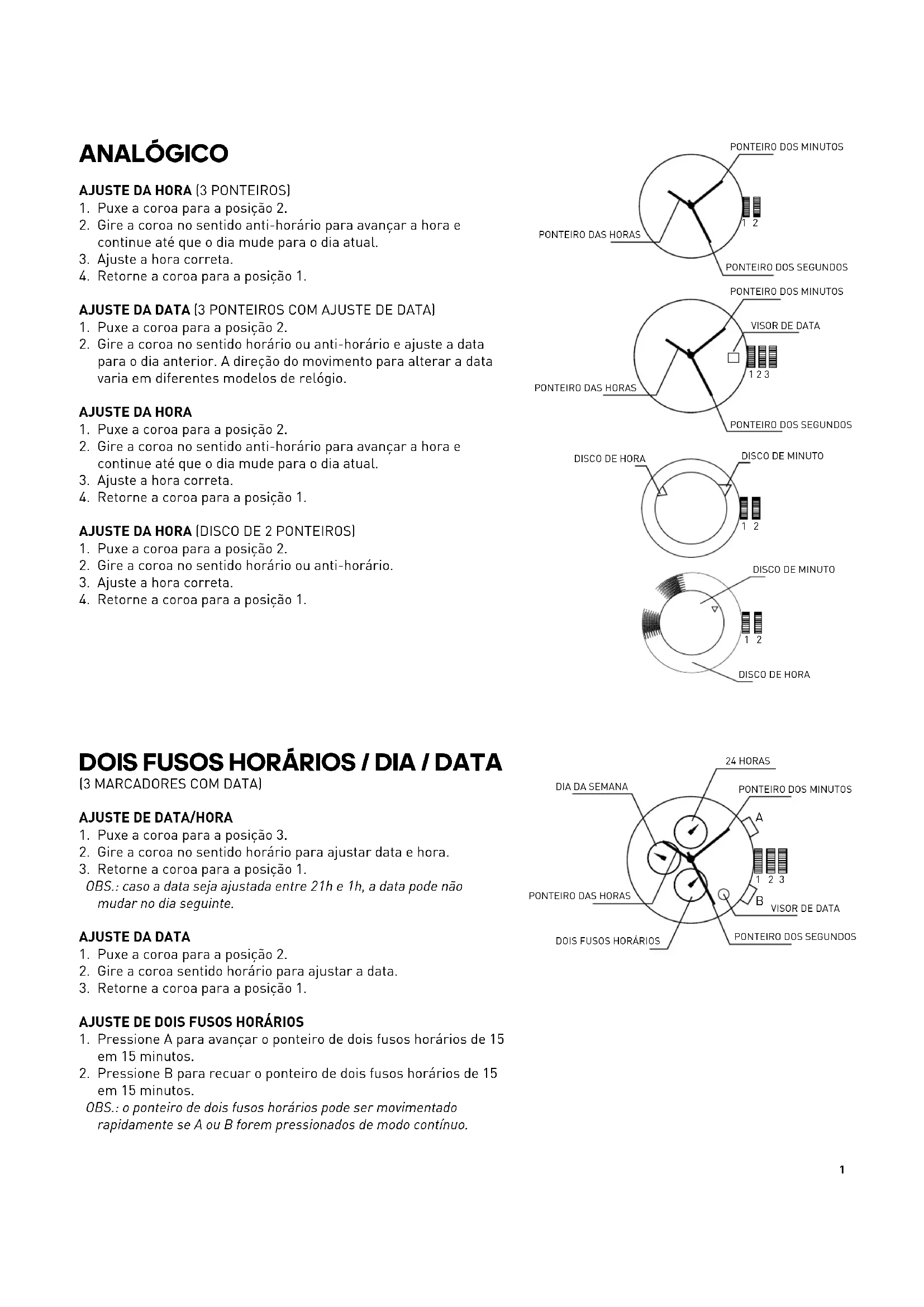 OBS.: o ponteiro de 24 horas movimenta-se conforme os ponteiros de hora e minuto. Ao ajustar a hora, certique-se de que o ponteiro de 24 horas está ajustado corretamente.