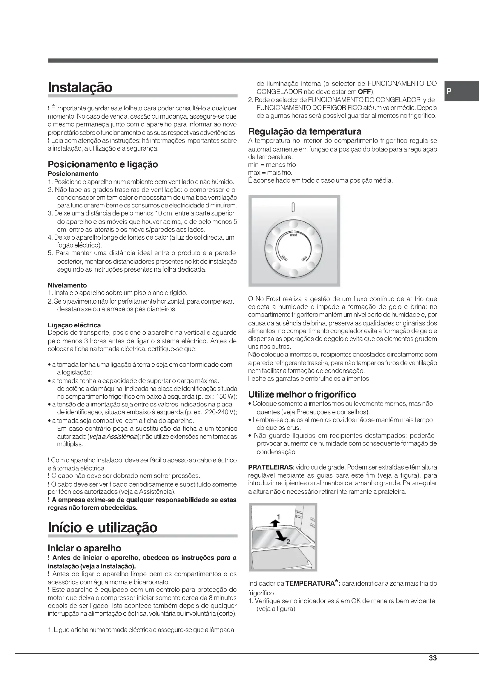 - a tomada seja compatível com a ficha do aparelho. Em caso contrário peça a substituição da ficha a um técnico autorizado (veja a Assistência); não utilize extensões nem tomadas múltiplas. ! Com o aparelho instalado, deve ser fácil o acesso ao cabo eléctrico e à tomada eléctrica. ! O cabo não deve ser dobrado nem sofrer pressões. ! O cabo deve ser verificado periodicamente e substituído somente por técnicos autorizados (veja a Assistência). ! A empresa exime-se de qualquer responsabilidade se estas regras não forem obedecidas. Início e utilização Iniciar o aparelho ! Antes de iniciar o aparelho, obedeça as instruções para a instalação (veja a Instalação). ! Antes de ligar o aparelho limpe bem os compartimentos e os acessórios com água morna e bicarbonato. ! Este aparelho é equipado com um controlo para protecção do motor que deixa o compressor iniciar somente cerca da 8 minutos depois de ser ligado. Isto acontece também depois de qualquer interrupção na alimentação eléctrica, voluntária ou involuntária (corte).
