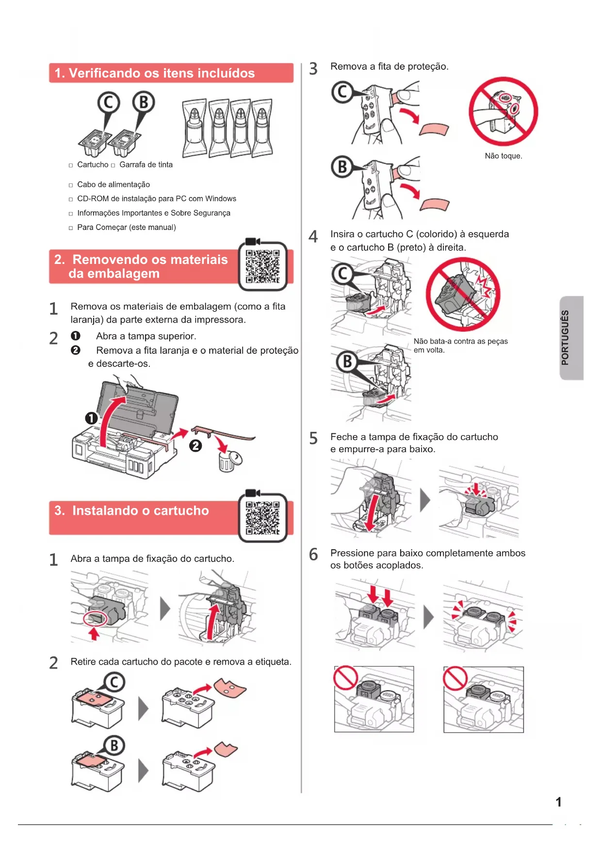 □ Cabo de alimentação □ Informações Importantes e Sobre Segurança □ Para Começar )este manual( □ CD-ROM de instalação para PC com Windows □ Cartucho □ Garrafa de tinta