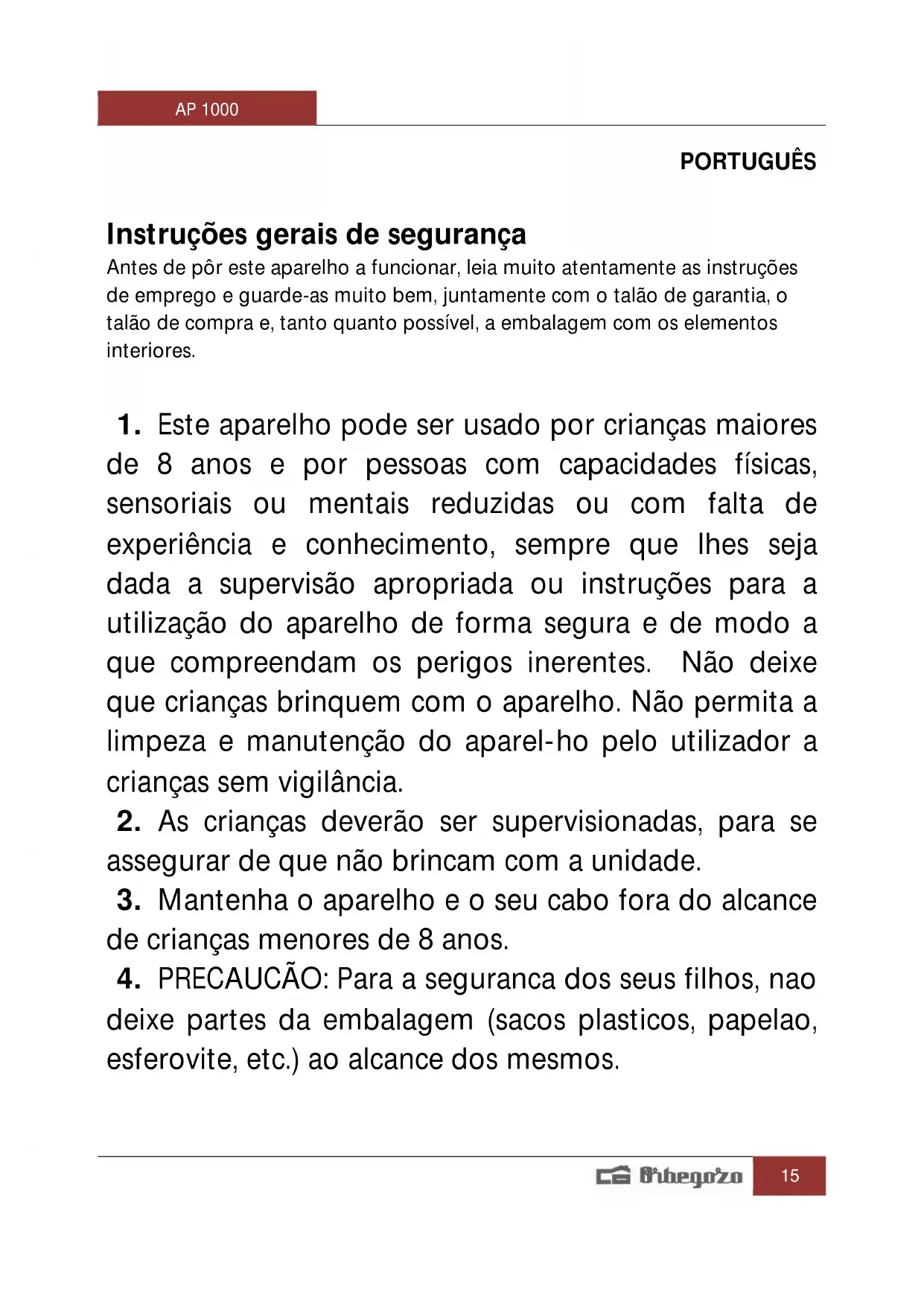 - Este aparecido pode ser uso por crianças maiores de 8 anos e por pessoas com capacidades físicas, sensoriais ou mentalais reduzidas ou com falta de experiência e conheçimento, sempre que lhes seja dada a supervisão apropriadou ou instruções para autilização do aparecido de forma segura e de modo aque comprehendam os perigos inerentes. Não deixe que crianças brinquem com o aparecido. Não permitta a limpeza e manutenção do aparel-ho pelo Utilizador a crianças sem vigilência.