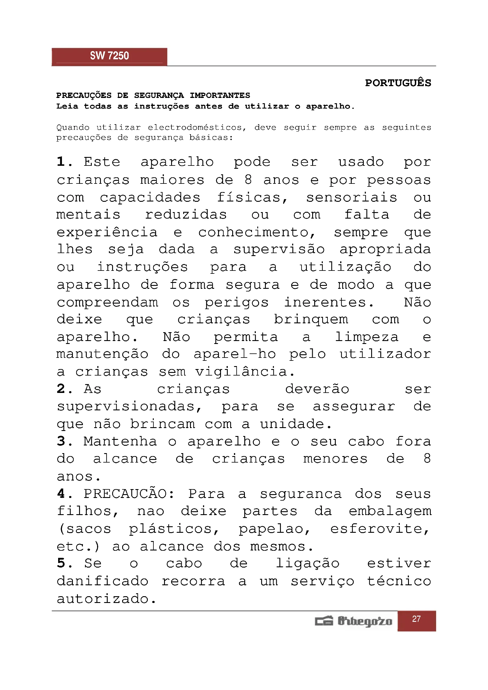 Encontre gratuitamente o manual do aparelho SW 7250 Orbegozo em formato PDF.