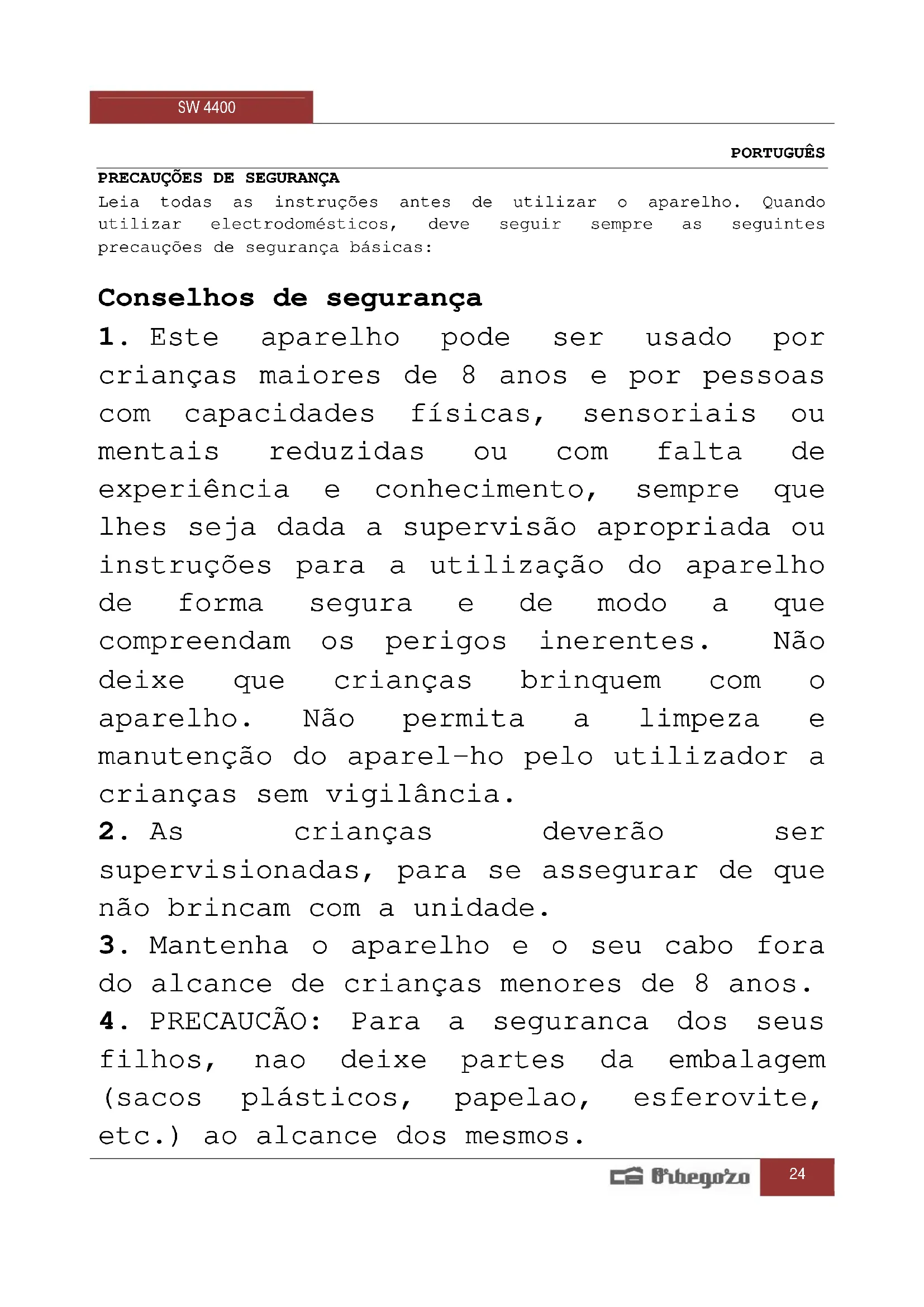 filhos, nao deixe partes da embalagem (sacos plásticos, papelao, esferovite, etc.) ao alcance dos mesmos.SW 4400