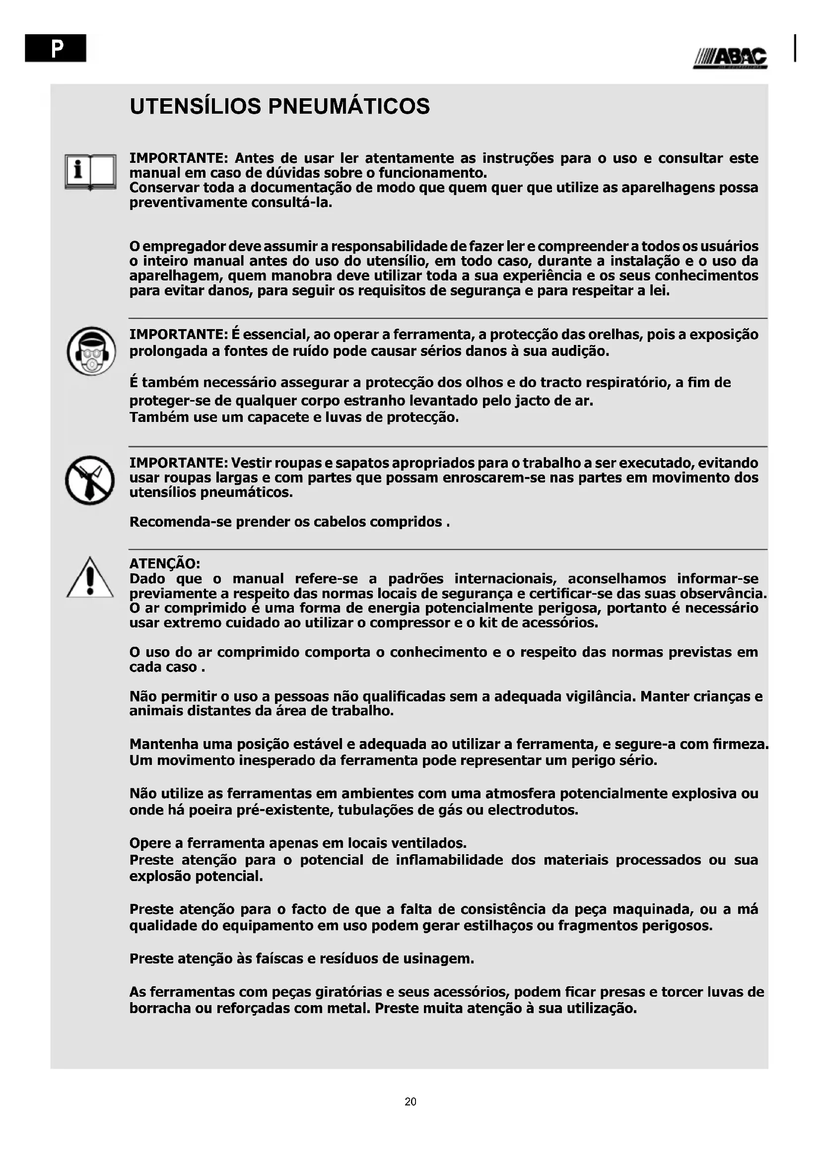 IMPORTANTE: Antes de usar ler atentamente as instruções para o uso e consultar este manual em caso de dúvidas sobre o funcionamento. Conservar toda a documentação de modo que quem quer que utilize as aparelhagens possa preventivamente consultá-la. O empregador deve assumir a responsabilidade de fazer ler e compreender a todos os usuários o inteiro manual antes do uso do utensílio, em todo caso, durante a instalação e o uso da aparelhagem, quem manobra deve utilizar toda a sua experiência e os seus conhecimentos para evitar danos, para seguir os requisitos de segurança e para respeitar a lei. IMPORTANTE: É essencial, ao operar a ferramenta, a protecção das orelhas, pois a exposição prolongada a fontes de ruído pode causar sérios danos à sua audição. É também necessário assegurar a protecção dos olhos e do tracto respiratório, a m de proteger-se de qualquer corpo estranho levantado pelo jacto de ar. Também use um capacete e luvas de protecção. IMPORTANTE: Vestir roupas e sapatos apropriados para o trabalho a ser executado, evitando usar roupas largas e com partes que possam enroscarem-se nas partes em movimento dos utensílios pneumáticos. Recomenda-se prender os cabelos compridos . ATENÇÃO: Dado que o manual refere-se a padrões internacionais, aconselhamos informar-se previamente a respeito das normas locais de segurança e certicar-se das suas observância. O ar comprimido é uma forma de energia potencialmente perigosa, portanto é necessário usar extremo cuidado ao utilizar o compressor e o kit de acessórios. O uso do ar comprimido comporta o conhecimento e o respeito das normas previstas em cada caso . Não permitir o uso a pessoas não qualicadas sem a adequada vigilância. Manter crianças e animais distantes da área de trabalho. Mantenha uma posição estável e adequada ao utilizar a ferramenta, e segure-a com rmeza. Um movimento inesperado da ferramenta pode representar um perigo sério. Não utilize as ferramentas em ambientes com uma atmosfera potencialmente explosiva ou onde há poeira pré-existente, tubulações de gás ou electrodutos. Opere a ferramenta apenas em locais ventilados. Preste atenção para o potencial de inamabilidade dos materiais processados ou sua explosão potencial. Preste atenção para o facto de que a falta de consistência da peça maquinada, ou a má qualidade do equipamento em uso podem gerar estilhaços ou fragmentos perigosos. Preste atenção às faíscas e resíduos de usinagem. As ferramentas com peças giratórias e seus acessórios, podem car presas e torcer luvas de borracha ou reforçadas com metal. Preste muita atenção à sua utilização.21