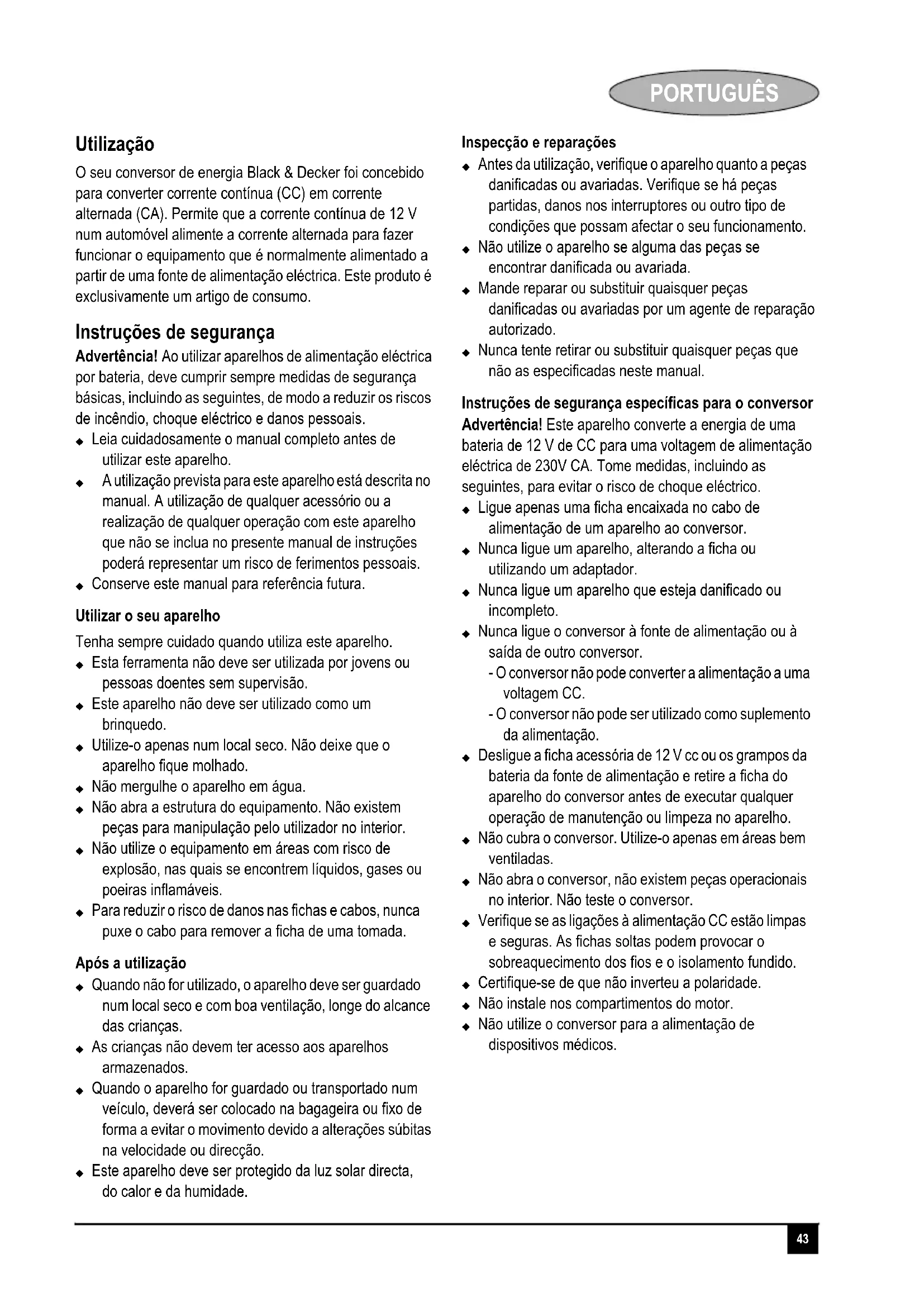 O seu conversor de energia Black & Decker foi concebido para converter corrente continua (CC) em corrente alternada (CA). Permitte que a corrente continua de 12 V num automóvel alimente a corrente alternada para fazer functional o equipamento que é normalmente alimentado a partir de uma fonte de alimentação eletrica. Este produit é exclusivamente um artigo de consumo.