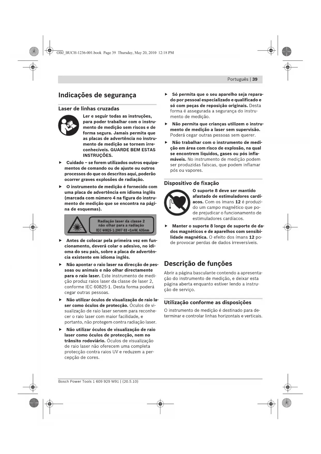 Indicações de segurança Laser de linhas cruzadas Ler e seguir todas as instruções, para poder trabalhar com o instru- mento de medição sem riscos e de forma segura. Jamais permita que as placas de advertência no instru- mento de medição se tornem irre- conhecíveis. GUARDE BEM ESTAS INSTRUÇÕES. f Cuidado – se forem utilizados outros equipa- mentos de comando ou de ajuste ou outros processos do que os descritos aqui, poderão ocorrer graves explosões de radiação. f O instrumento de medição é fornecido com uma placa de advertência em idioma inglês (marcada com número 4 na figura do instru- mento de medição que se encontra na pági- na de esquemas). f Antes de colocar pela primeira vez em fun- cionamento, deverá colar o adesivo, no idi- oma do seu país, sobre a placa de advertên- cia existente em idioma inglês. f Não apontar o raio laser na direcção de pes- soas ou animais e não olhar directamente para o raio laser. Este instrumento de medi- ção produz raios laser da classe de laser 2, conforme IEC 60825-1. Desta forma poderá cegar outras pessoas. f Não utilizar óculos de visualização de raio la- ser como óculos de protecção. Óculos de vi- sualização de raio laser servem para reconhe- cer o raio laser com maior facilidade, e portanto, não protegem contra radiação laser. f Não utilizar óculos de visualização de raio laser como óculos de protecção, nem no trânsito rodoviário. Óculos de visualização de raio laser não oferecem uma completa protecção contra raios UV e reduzem a per- cepção de cores. f Só permita que o seu aparelho seja repara- do por pessoal especializado e qualificado e só com peças de reposição originais. Desta forma é assegurada a segurança do instru- mento de medição. f Não permita que crianças utilizem o instru- mento de medição a laser sem supervisão. Poderá cegar outras pessoas sem querer. f Não trabalhar com o instrumento de medi- ção em área com risco de explosão, na qual se encontrem líquidos, gases ou pós infla- máveis. No instrumento de medição podem ser produzidas faíscas, que podem inflamar pós ou vapores. Dispositivo de fixação O suporte 8 deve ser mantido afastado de estimuladores cardí- acos. Com os ímans 12 é produzi- do um campo magnético que po- de prejudicar o funcionamento de estimuladores cardíacos. f Manter o suporte 8 longe de suporte de da- dos magnéticos e de aparelhos com sensibi- lidade magnética. O efeito dos ímans 12 po- de provocar perdas de dados irreversíveis. Descrição de funções Abrir a página basculante contendo a apresenta- ção do instrumento de medição, e deixar esta página aberta enquanto estiver lendo a instru- ção de serviço. Utilização conforme as disposições O instrumento de medição é destinado para de- terminar e controlar linhas horizontais e verticais. OBJ_BUCH-1236-001.book Page 39 Thursday, May 20, 2010 12:18 PM40 | Português 1 609 929 W91 | (20.5.10) Bosch Power Tools Dados técnicos Componentes ilustrados A numeração dos componentes ilustrados refe- re-se à apresentação do instrumento de medi- ção na página de esquemas. 1 Abertura para saída do raio laser 2 Fixação do tripé 1/4" 3 Interruptor de ligar-desligar 4 Placa de advertência laser 5 Número de série 6 Travamento da tampa do compartimento da pilha 7 Tampa do compartimento da pilha 8 Dispositivo de fixação 9 Parafuso de fixação do suporte 10 Furos de aparafusamento do suporte 11 Guia do cinto 12 Imans 13 Fixação do tripé de 1/4" no suporte 14 Fixação do tripé de 5/8" no suporte 15 Bolsa de protecção 16 Óculos para visualização de raio laser* 17 Placa de medição com pé* 18 Tripé*