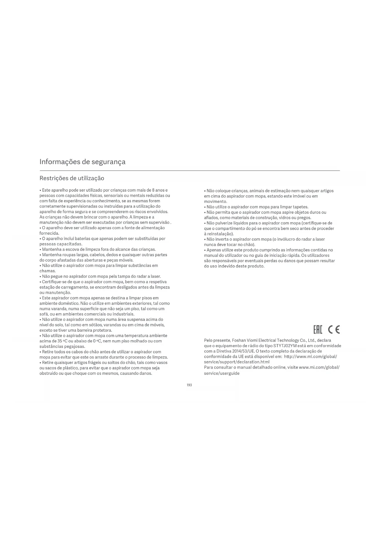 Pelo presente, Foshan Viomi Electrical Technology Co., Ltd., declara que o equipamento de rádio do tipo STYTJ02YM está em conformidade com a Diretiva 2014/53/UE. O texto completo da declaração de conformidade da UE está disponível em: hp://www.mi.com/global/ Para consultar o manual detalhado online, visite www.mi.com/global/ service/userguide service/support/declaration.html• AVISO: Para carregar a bateria, utilize apenas a unidade de alimentação amovível disponibilizada com o aparelho.