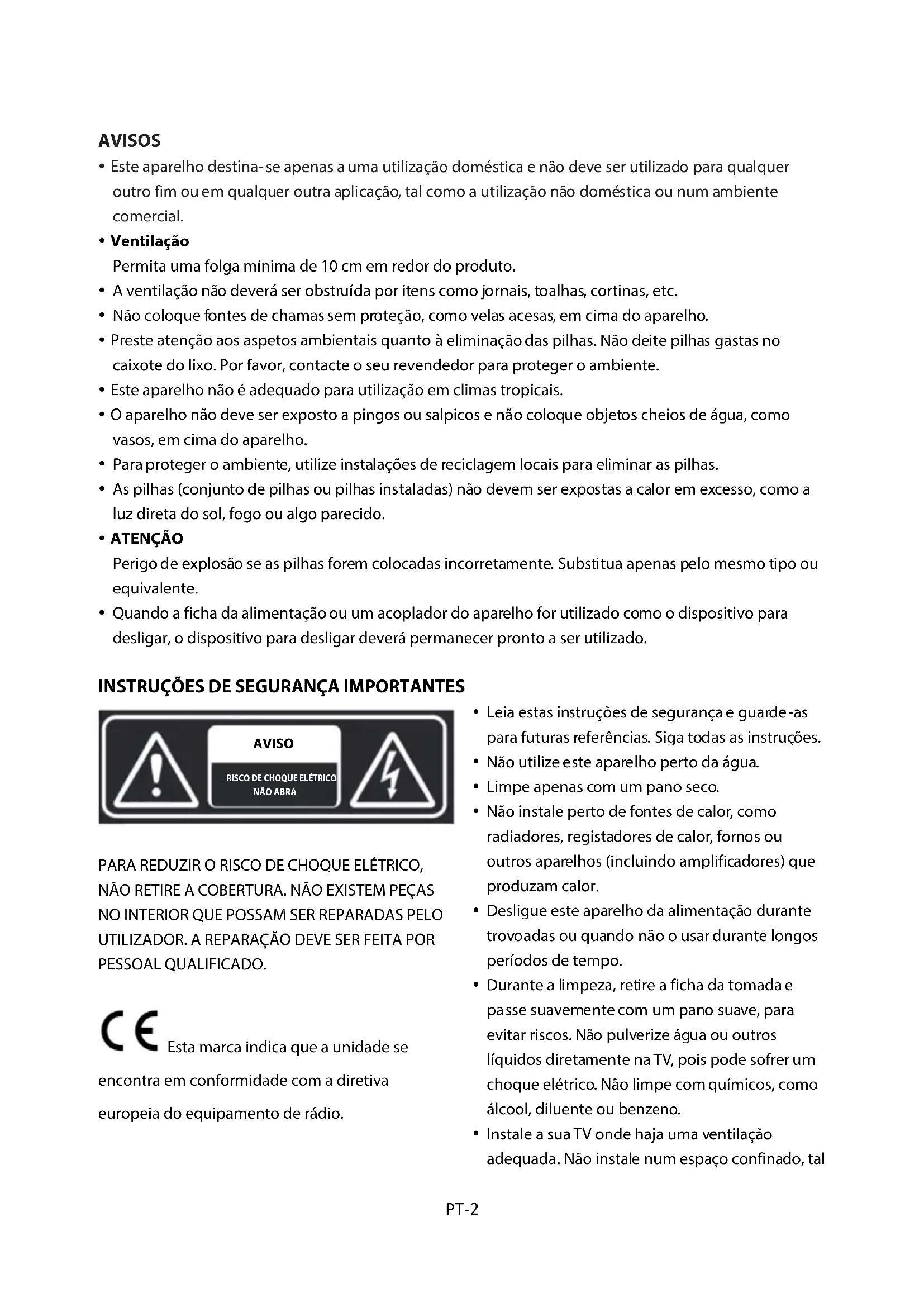 PARA REDUZIR O RISCO DE CHOQUE ELÉTRICO, NÃO RETIRE A COBERTURA. NÃO EXISTEM PEÇAS NO INTERIOR QUE POSSAM SER REPARADAS PELO UTILIZADOR. A REPARAÇÃO DEVE SER FEITA POR PESSOAL QUALIFICADO. Esta marca indica que a unidade se encontra em conformidade com a diretiva europeia do equipamento de rádio.