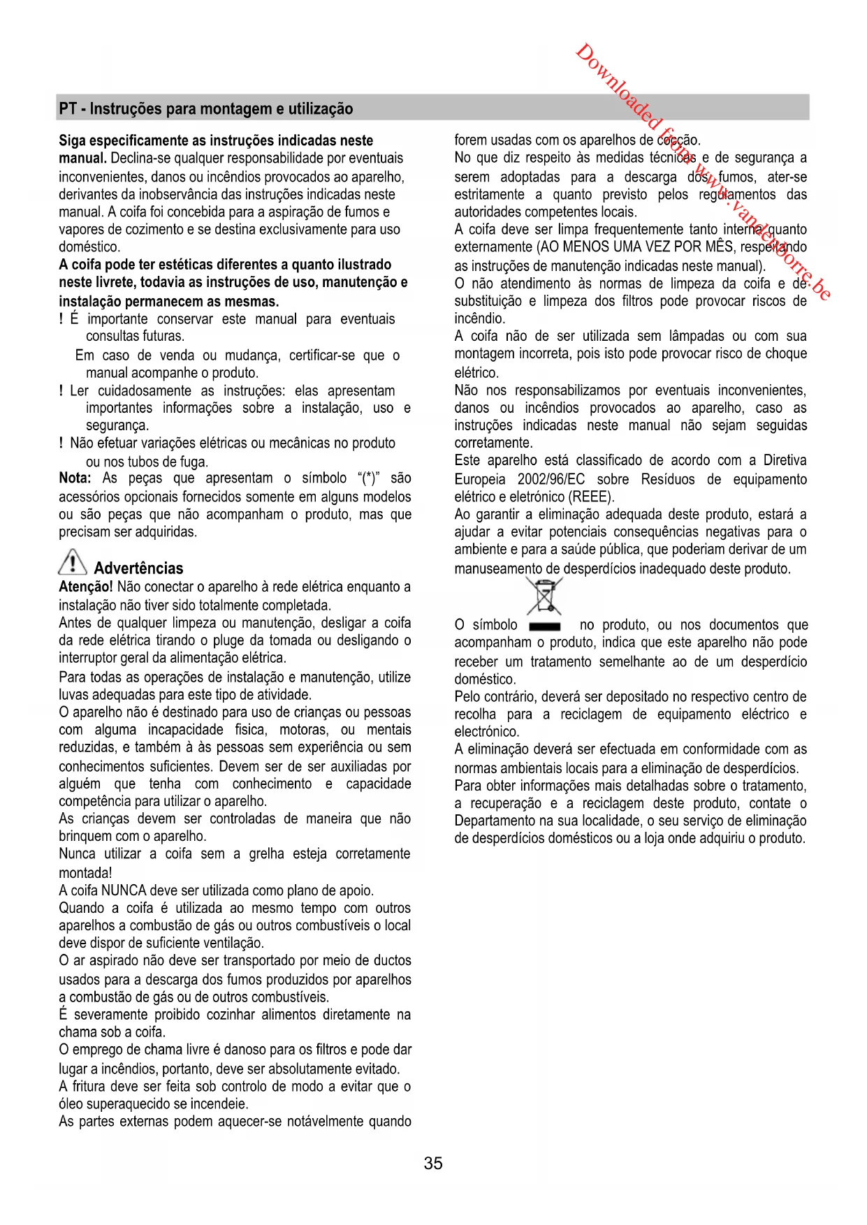 Downloaded from www.vandenborre.be35 PT - Instruções para montagem e utilização Siga especificamente as instruções indicadas neste manual. Declina-se qualquer responsabilidade por eventuais inconvenientes, danos ou incêndios provocados ao aparelho, derivantes da inobservância das instruções indicadas neste manual. A coifa foi concebida para a aspiração de fumos e vapores de cozimento e se destina exclusivamente para uso doméstico. A coifa pode ter estéticas diferentes a quanto ilustrado neste livrete, todavia as instruções de uso, manutenção e instalação permanecem as mesmas. ! É importante conservar este manual para eventuais consultas futuras. Em caso de venda ou mudança, certificar-se que o manual acompanhe o produto. ! Ler cuidadosamente as instruções: elas apresentam importantes informações sobre a instalação, uso e segurança. ! Não efetuar variações elétricas ou mecânicas no produto ou nos tubos de fuga. Nota: As peças que apresentam o símbolo “(*)” são acessórios opcionais fornecidos somente em alguns modelos ou são peças que não acompanham o produto, mas que precisam ser adquiridas. Advertências Atenção! Não conectar o aparelho à rede elétrica enquanto a instalação não tiver sido totalmente completada. Antes de qualquer limpeza ou manutenção, desligar a coifa da rede elétrica tirando o pluge da tomada ou desligando o interruptor geral da alimentação elétrica. Para todas as operações de instalação e manutenção, utilize luvas adequadas para este tipo de atividade. O aparelho não é destinado para uso de crianças ou pessoas com alguma incapacidade fisica, motoras, ou mentais reduzidas, e também à às pessoas sem experiência ou sem conhecimentos suficientes. Devem ser de ser auxiliadas por alguém que tenha com conhecimento e capacidade competência para utilizar o aparelho. As crianças devem ser controladas de maneira que não brinquem com o aparelho. Nunca utilizar a coifa sem a grelha esteja corretamente montada! A coifa NUNCA deve ser utilizada como plano de apoio. Quando a coifa é utilizada ao mesmo tempo com outros aparelhos a combustão de gás ou outros combustíveis o local deve dispor de suficiente ventilação. O ar aspirado não deve ser transportado por meio de ductos usados para a descarga dos fumos produzidos por aparelhos a combustão de gás ou de outros combustíveis. É severamente proibido cozinhar alimentos diretamente na chama sob a coifa. O emprego de chama livre é danoso para os filtros e pode dar lugar a incêndios, portanto, deve ser absolutamente evitado. A fritura deve ser feita sob controlo de modo a evitar que o óleo superaquecido se incendeie. As partes externas podem aquecer-se notávelmente quando forem usadas com os aparelhos de cocção. No que diz respeito às medidas técnicas e de segurança a serem adoptadas para a descarga dos fumos, ater-se estritamente a quanto previsto pelos regulamentos das autoridades competentes locais. A coifa deve ser limpa frequentemente tanto interna quanto externamente (AO MENOS UMA VEZ POR MÊS, respeitando as instruções de manutenção indicadas neste manual). O não atendimento às normas de limpeza da coifa e de substituição e limpeza dos filtros pode provocar riscos de incêndio. A coifa não de ser utilizada sem lâmpadas ou com sua montagem incorreta, pois isto pode provocar risco de choque elétrico. Não nos responsabilizamos por eventuais inconvenientes, danos ou incêndios provocados ao aparelho, caso as instruções indicadas neste manual não sejam seguidas corretamente. Este aparelho está classificado de acordo com a Diretiva Europeia 2002/96/EC sobre Resíduos de equipamento elétrico e eletrónico (REEE). Ao garantir a eliminação adequada deste produto, estará a ajudar a evitar potenciais consequências negativas para o ambiente e para a saúde pública, que poderiam derivar de um manuseamento de desperdícios inadequado deste produto. O símbolo no produto, ou nos documentos que acompanham o produto, indica que este aparelho não pode receber um tratamento semelhante ao de um desperdício doméstico. Pelo contrário, deverá ser depositado no respectivo centro de recolha para a reciclagem de equipamento eléctrico e electrónico. A eliminação deverá ser efectuada em conformidade com as normas ambientais locais para a eliminação de desperdícios. Para obter informações mais detalhadas sobre o tratamento, a recuperação e a reciclagem deste produto, contate o Departamento na sua localidade, o seu serviço de eliminação de desperdícios domésticos ou a loja onde adquiriu o produto. Downloaded from www.vandenborre.be36 Uso A coifa é fabricada para ser utilizada na versão aspirante, com exaustão externa do ar, ou filtrante, com recirculação interna. Versão aspirante Os vapores são evacuados para o exterior por meio de um tubo de descarga fixado á flange de conexão que se encontra sobre o exaustor. O diâmetro do tubo de descarga deve ser equivalente ao diâmetro do anel de conexão. Na parte horizontal o tubo deve ter uma leve inclinação para cima (cerca de 10°) de modo a poder transportar o ar para fora mais facilmente. Se o exaustor for dotada de filtros de carvão ativo, estes deverão ser tirados. Conectar a coifa ao tubos e orifícios de descarga de parede com diâmetro equivalente à saída de ar (flange de união). O uso de tubos ou orifícios de descarga de parede com diâmetro inferior pode provocar a diminuição da performance de aspiração e um drástico aumento do ruído. Não nos responsabilizamos a este respeito. ! Utilizar um tubo condutor com o comprimento não inferior ao indicado. ! Utilizar um tubo condutor com o menor número possível de curvas (ângulo máximo da curva: 90ºC 90°). ! Evitar alterações drásticas da seção do tubo (diâmetro). ! Usar um tubo condutor com o interior mais liso possível. ! O material do tubo condutor deve ser aprovado e estar em conformidade c