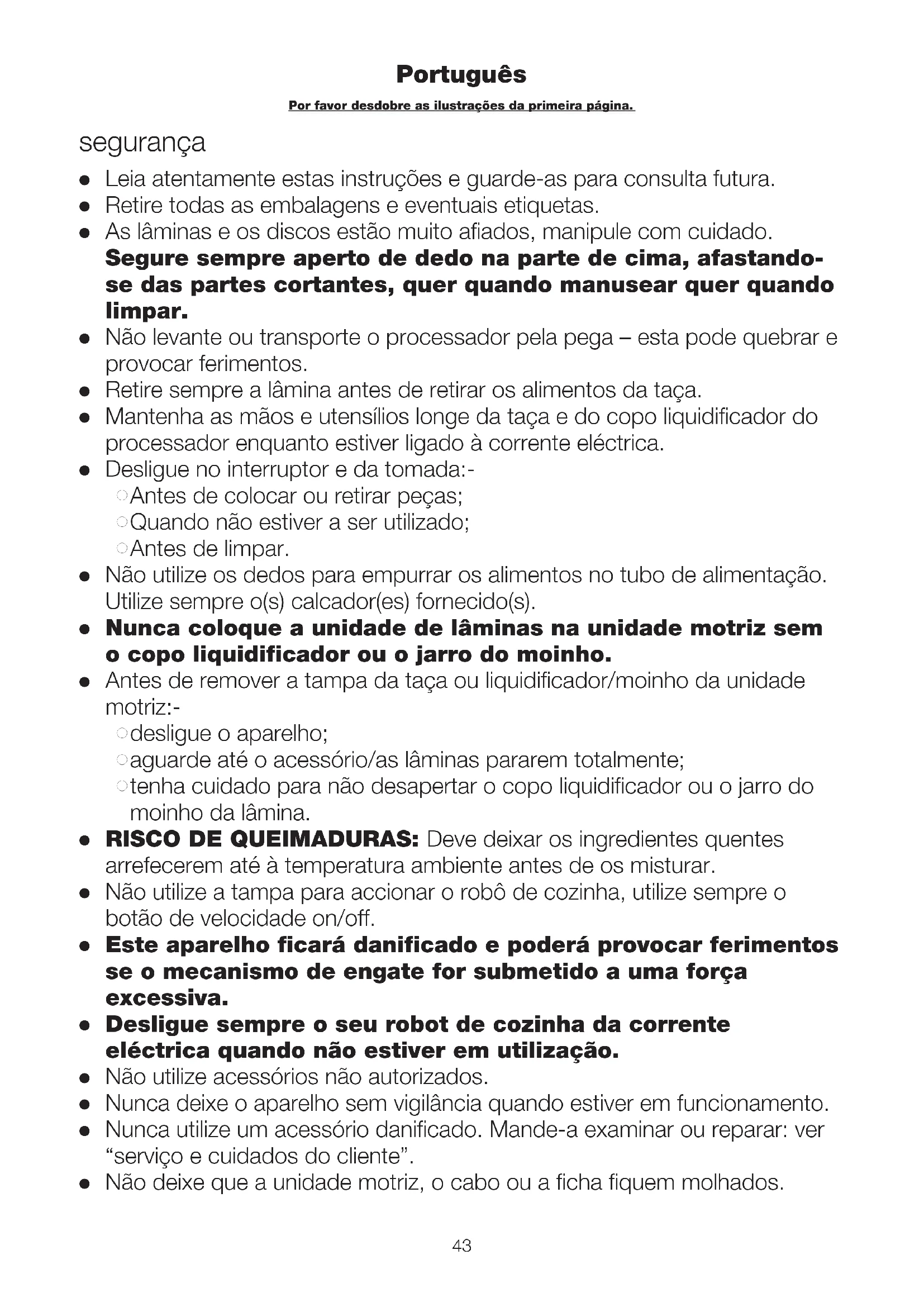 As lâminas e os discos estão muito afiados, manipule com cuidado. Segure sempre aperto de dedo na parte de cima, afastando- se das partes cortantes, quer quando manusear quer quando limpar.