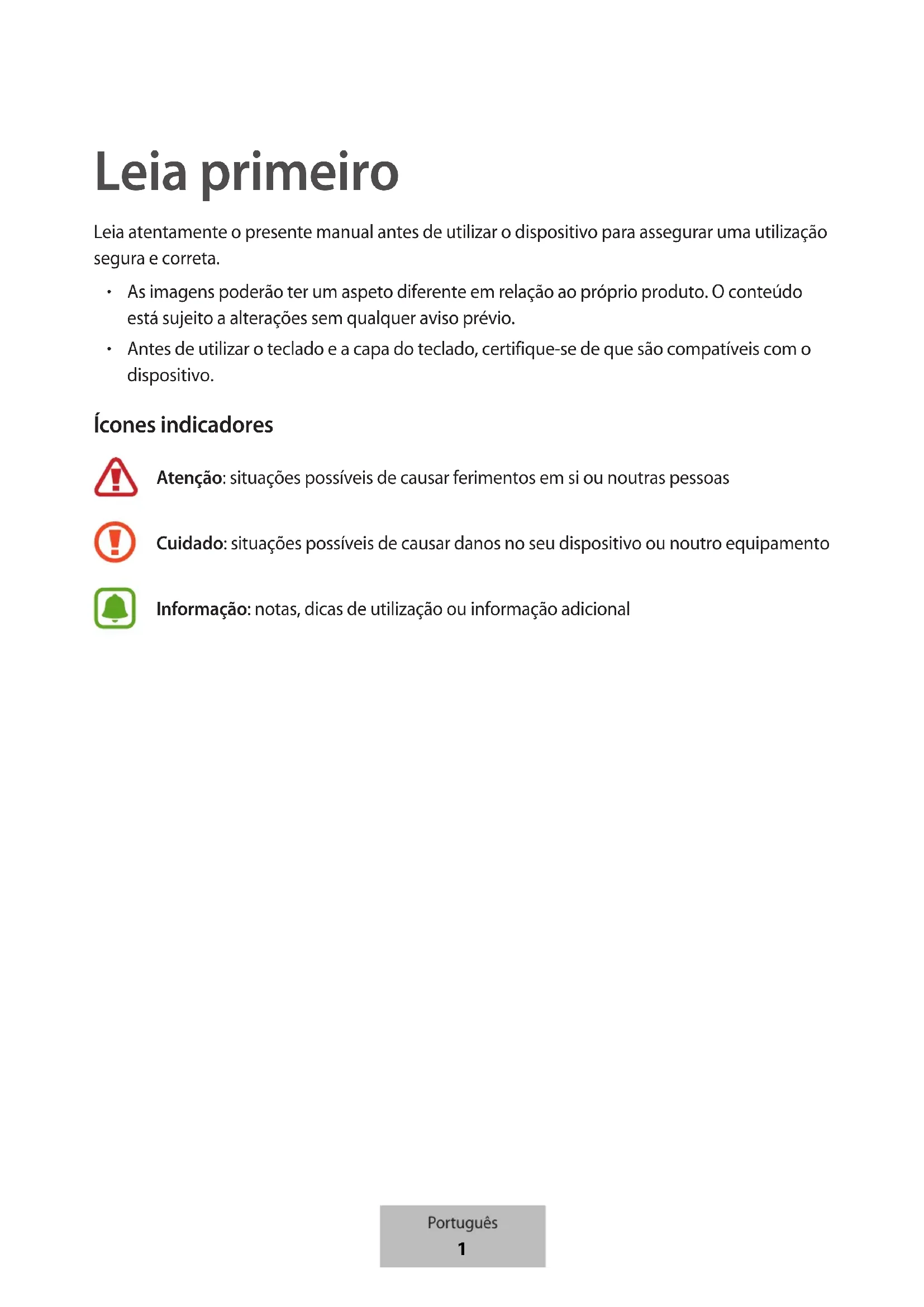 Antes de utilizar o teclado e a capa do teclado, certifique-se de que são compatíveis com o dispositivo. Ícones indicadores Atenção: situações possíveis de causar ferimentos em si ou noutras pessoas Cuidado: situações possíveis de causar danos no seu dispositivo ou noutro equipamento Informação: notas, dicas de utilização ou informação adicional Português