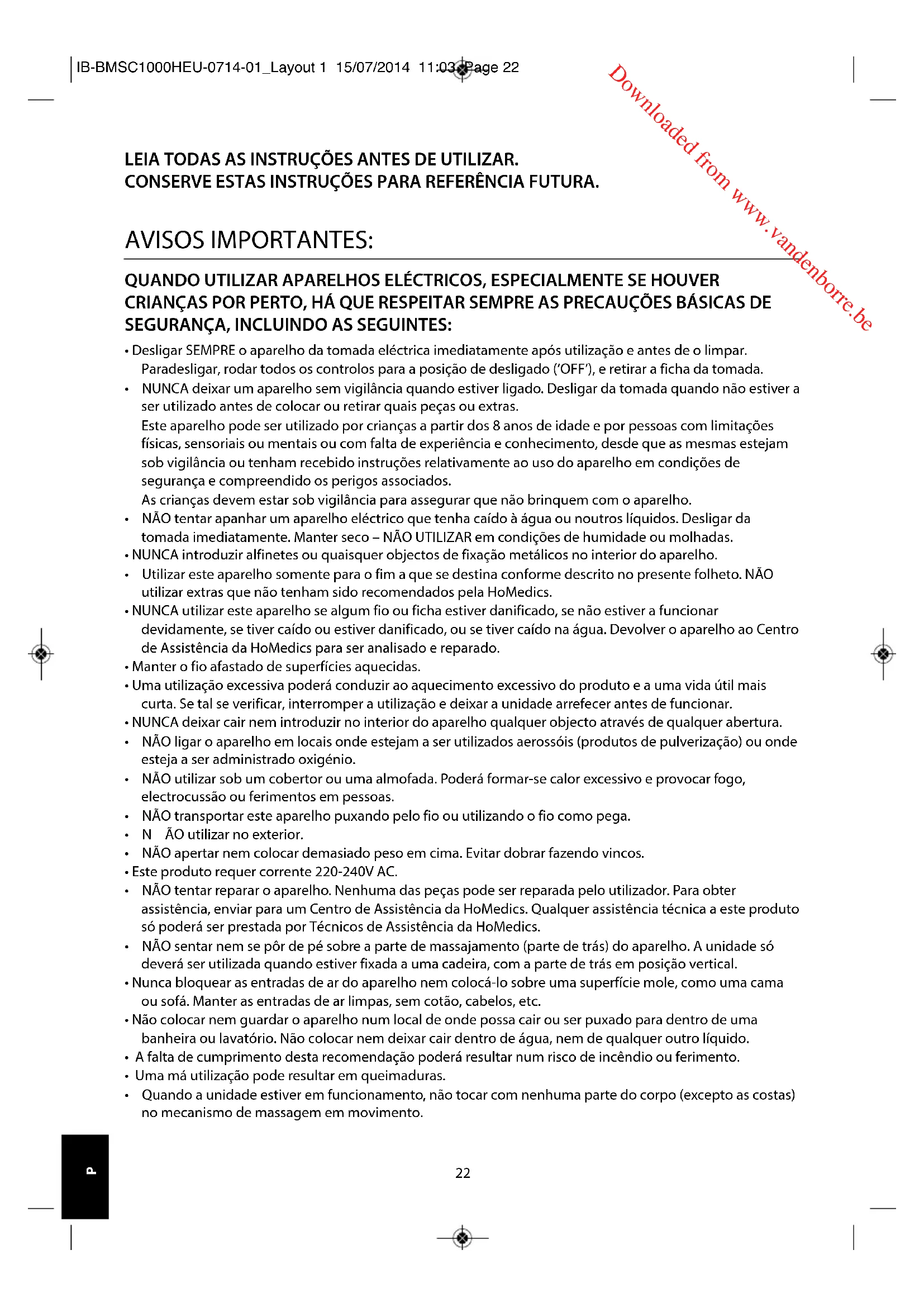 - Quando a unidade estiver em funcionamento, não tocar com nenhuma parte do corpo (excepto as costas) no mecanismo de massagem em movimento. IB-BMSC1000HEU-0714-01_Layout 1 15/07/2014 11:03 Page 22 Downloaded from www.vandenborre.be23