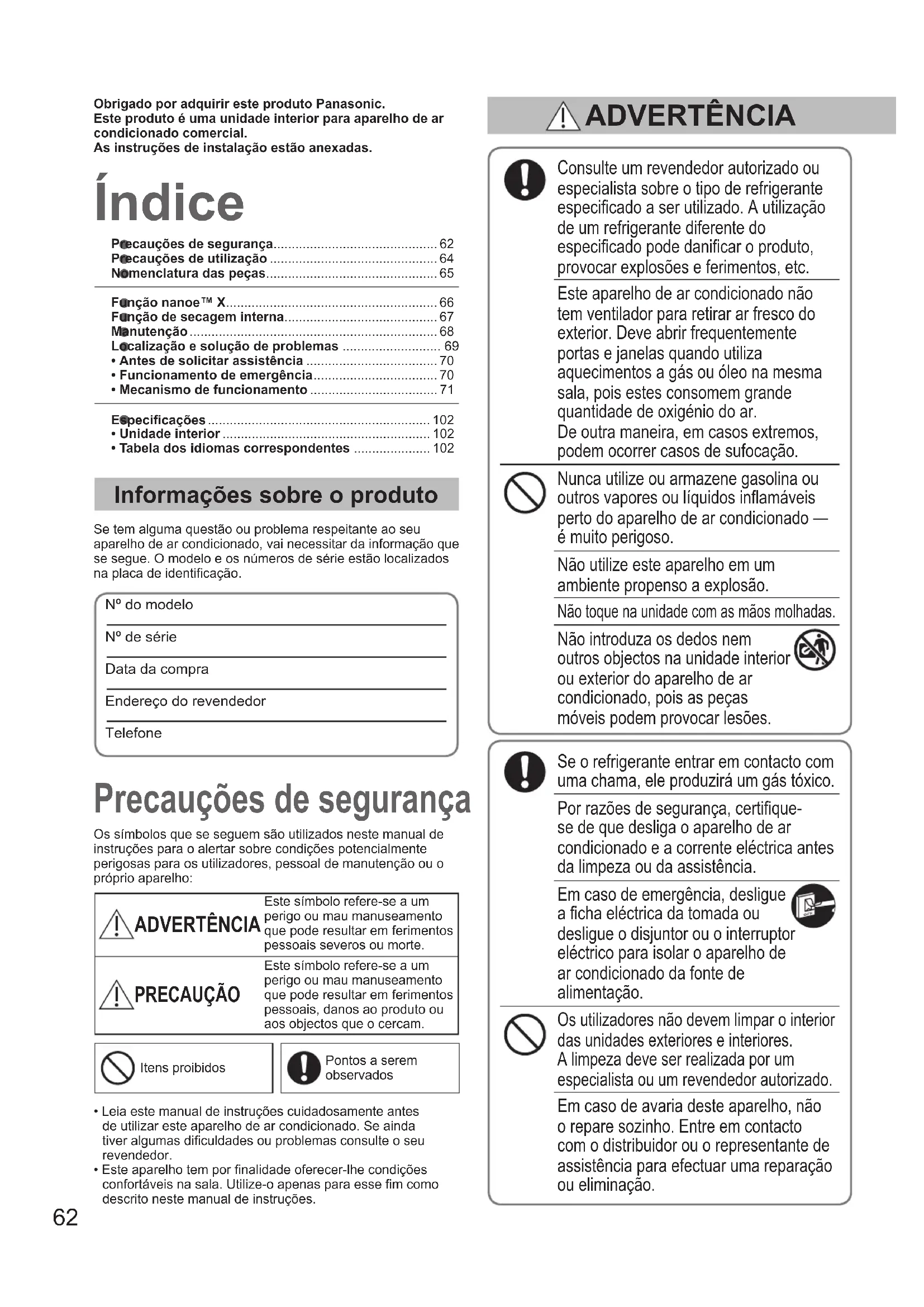 - Tabela dos idiomas correspondentes ..................... 102 Índice Precauções de segurança Informações sobre o produto Se tem alguma questão ou problema respeitante ao seu aparelho de ar condicionado, vai necessitar da informação que se segue. O modelo e os números de série estão localizados na placa de identicação.Nº do modelo Nº de série Data da compraEndereço do revendedorTelefoneConsulte um revendedor autorizado ou especialista sobre o tipo de refrigerante especicado a ser utilizado. A utilização de um refrigerante diferente do especicado pode danicar o produto, provocar explosões e ferimentos, etc.Este aparelho de ar condicionado não tem ventilador para retirar ar fresco do exterior. Deve abrir frequentemente portas e janelas quando utiliza aquecimentos a gás ou óleo na mesma sala, pois estes consomem grande quantidade de oxigénio do ar. De outra maneira, em casos extremos, podem ocorrer casos de sufocação.Nunca utilize ou armazene gasolina ou outros vapores ou líquidos inamáveis perto do aparelho de ar condicionado — é muito perigoso.Não utilize este aparelho em um ambiente propenso a explosão.Não toque na unidade com as mãos molhadas.Não introduza os dedos nem outros objectos na unidade interior ou exterior do aparelho de ar condicionado, pois as peças móveis podem provocar lesões.Se o refrigerante entrar em contacto com uma chama, ele produzirá um gás tóxico.Por razões de segurança, certique-se de que desliga o aparelho de ar condicionado e a corrente eléctrica antes da limpeza ou da assistência.Em caso de emergência, desligue a cha eléctrica da tomada ou desligue o disjuntor ou o interruptor eléctrico para isolar o aparelho de ar condicionado da fonte de alimentação.Os utilizadores não devem limpar o interior das unidades exteriores e interiores. A limpeza deve ser realizada por um especialista ou um revendedor autorizado.Em caso de avaria deste aparelho, não o repare sozinho. Entre em contacto com o distribuidor ou o representante de assistência para efectuar uma reparação ou eliminação.Os símbolos que se seguem são utilizados neste manual de instruções para o alertar sobre condições potencialmente perigosas para os utilizadores, pessoal de manutenção ou o próprio aparelho: ADVERTÊNCIA Este símbolo refere-se a um perigo ou mau manuseamento que pode resultar em ferimentos pessoais severos ou morte. PRECAUÇÃO Este símbolo refere-se a um perigo ou mau manuseamento que pode resultar em ferimentos pessoais, danos ao produto ou aos objectos que o cercam.Itens proibidosPontos a serem observados• Leia este manual de instruções cuidadosamente antes de utilizar este aparelho de ar condicionado. Se ainda tiver algumas diculdades ou problemas consulte o seu revendedor.• Este aparelho tem por nalidade oferecer-lhe condições confortáveis na sala. Utilize-o apenas para esse m como descrito neste manual de instruções.Obrigado por adquirir este produto Panasonic.Este produto é uma unidade interior para aparelho de ar condicionado comercial.As instruções de instalação estão anexadas. ADVERTÊNCIA OI_00_311238_EU.indb 62 2019/5/10 9:37:5563 PORTUGUÊS Este equipamento pretende ser usado por peritos ou utilizadores com formação em lojas, na indústria leve e em quintas, ou para utilização comercial por pessoas não especializadas. Este aparelho pode ser utilizado por crianças acima de 8 anos de idade e por pessoas com deciências físicas, sensoriais ou mentais, ou com falta de experiência e conhecimento, desde que sejam supervisionados ou instruídos sobre a utilização do aparelho de maneira segura e desde que compreendam os perigos envolvidos. Crianças não devem brincar com o aparelho. A limpeza e manutenção pelo utilizador não devem ser realizadas por crianças sem supervisão. Mantenha o alarme de incêndio e a saída de ar a pelo menos 1,5 m da unidade. Não arrefeça ou aqueça demasiado a sala quando estiverem presentes bebés ou pessoas inválidas. Não ligue e desligue o aparelho de ar condicionado utilizando o interruptor principal. Utilize o botão de operação ON/OFF. Não coloque nada na saída de ar da unidade exterior. É muito perigoso devido à alta velocidade de rotação do ventilador. Não toque na entrada de ar ou nas pás de alumínio aadas da unidade exterior. Pode sofrer ferimentos. Não cole nenhum objecto na CAIXA DA VENTOINHA. Pode sofrer ferimentos e danicar a unidade. Providencie uma tomada eléctrica para ser utilizada exclusivamente para cada unidade, bem como um interruptor para a fonte de energia, um disjuntor de fugas de ligação à terra (ELCB) ou um dispositivo de corrente residual (RCD) para protecção de sobrecorrente na linha exclusiva. Providencie uma tomada eléctrica exclusivamente para cada unidade e integrar meios de desactivação total com separação de contacto em todos os pólos da instalação eléctrica xa, conforme as normas de ação. Para impedir possíveis perigos devido a falha do isolamento, tem de ligar a unidade à massa. De modo a evitar o sobreaquecimento e incêndios, não utilize cabos modicados, cabos partilhados, extensões eléctricas nem cabos não especicados. Numa situação de anomalia/avaria do produto, interrompa o seu uso e retire a cha da tomada ou e o disjuntor. (Risco de fumo/incêndio/choque eléctrico) Exemplos de anormalidade/avaria:
