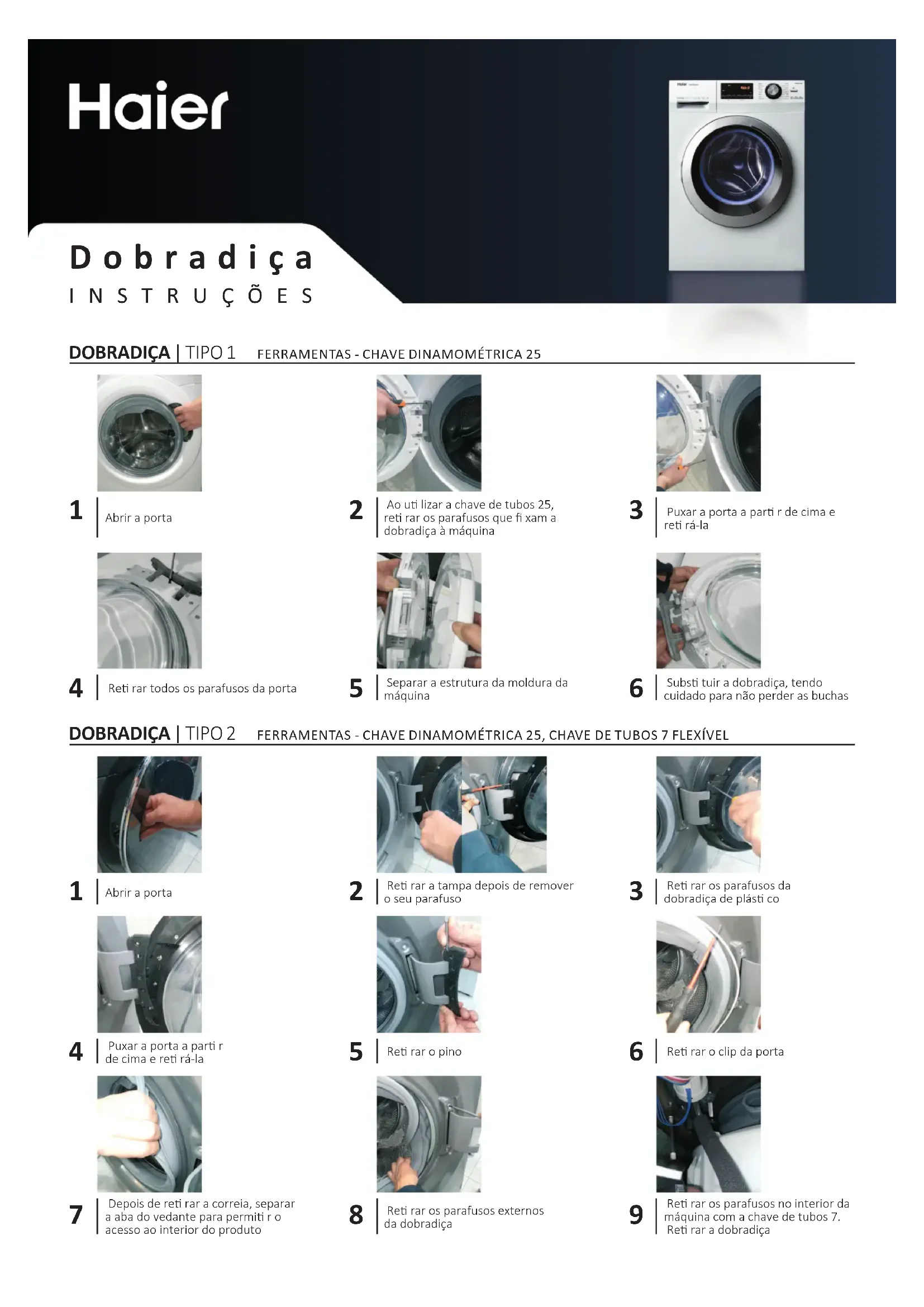 Abrir a porta Ao u lizar a chave de tubos 25, re rar os parafusos que fi xam a dobradiça à máquina Puxar a porta a par r de cima e re rá-la Re rar todos os parafusos da porta Separar a estrutura da moldura da máquina Subs tuir a dobradiça, tendo cuidado para não perder as buchas DOBRADIÇA | TIPO 2 FERRAMENTAS - CHAVE DINAMOMÉTRICA 25, CHAVE DE TUBOS 7 FLEXÍVEL
