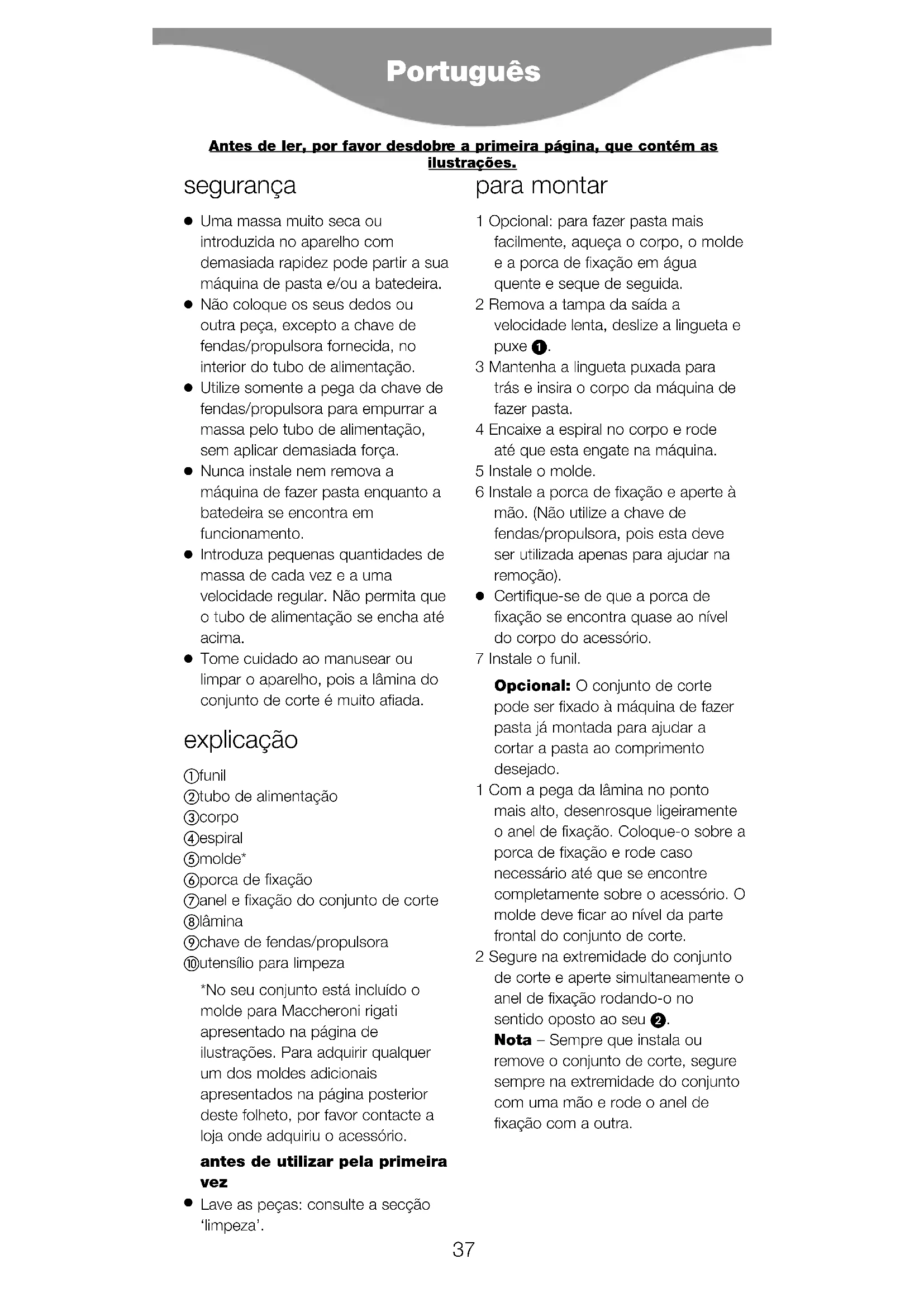 Tome cuidado ao manusear ou limpar o aparelho, pois a lâmina do conjunto de corte é muito afiada. explicação funil tubo de alimentação corpo espiral molde* porca de fixação anel e fixação do conjunto de corte lâmina chave de fendas/propulsora utensílio para limpeza *No seu conjunto está incluído o molde para Maccheroni rigati apresentado na página de ilustrações. Para adquirir qualquer um dos moldes adicionais apresentados na página posterior deste folheto, por favor contacte a loja onde adquiriu o acessório. antes de utilizar pela primeira vez