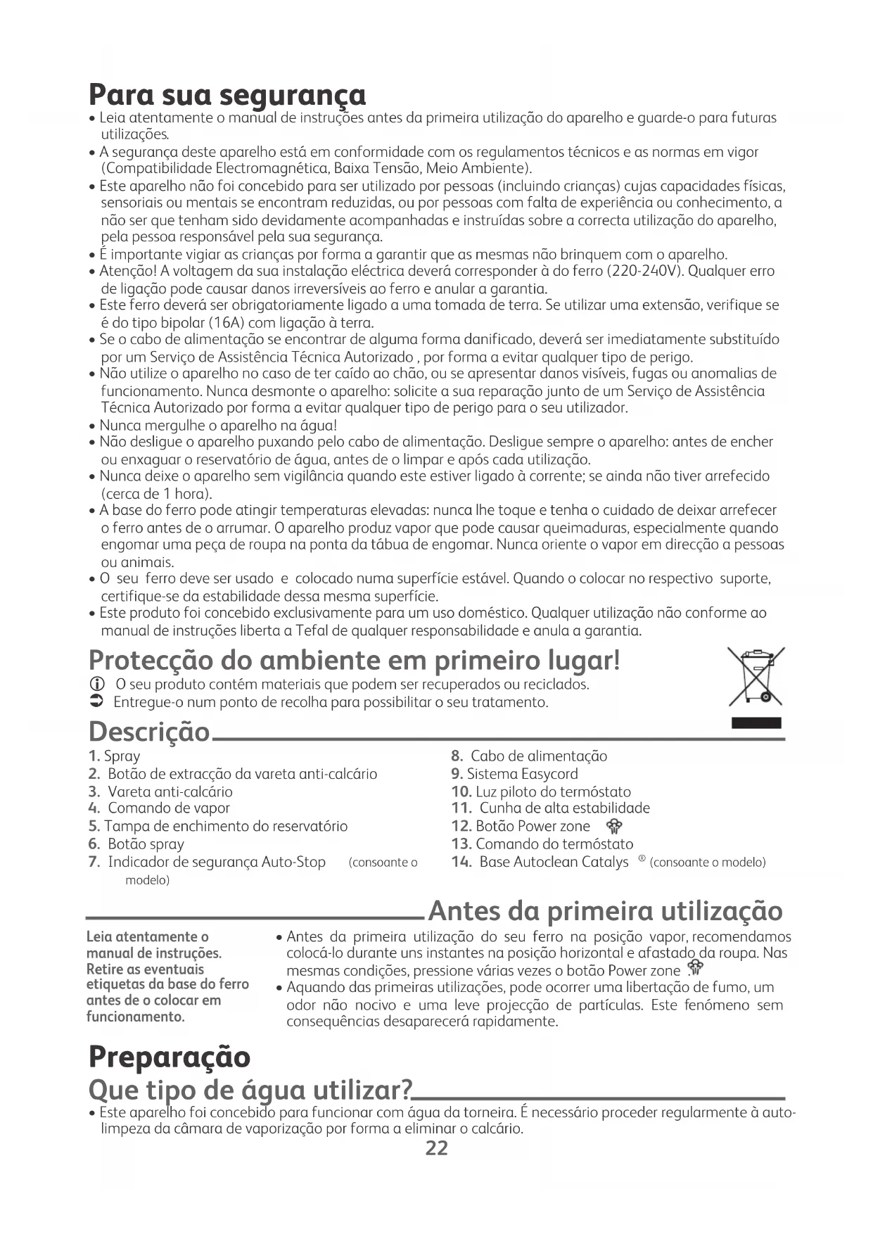 - Este aparelho foi concebido para funcionar com água da torneira. É necessário proceder regularmente à auto- limpeza da câmara de vaporização por forma a eliminar o calcário. Leia atentamente o manual de instruções. Retire as eventuais etiquetas da base do ferro antes de o colocar em funcionamento. 1800119869 FV53XX E0 FTN TE_110x154 14/12/10 11:30 Page22EN