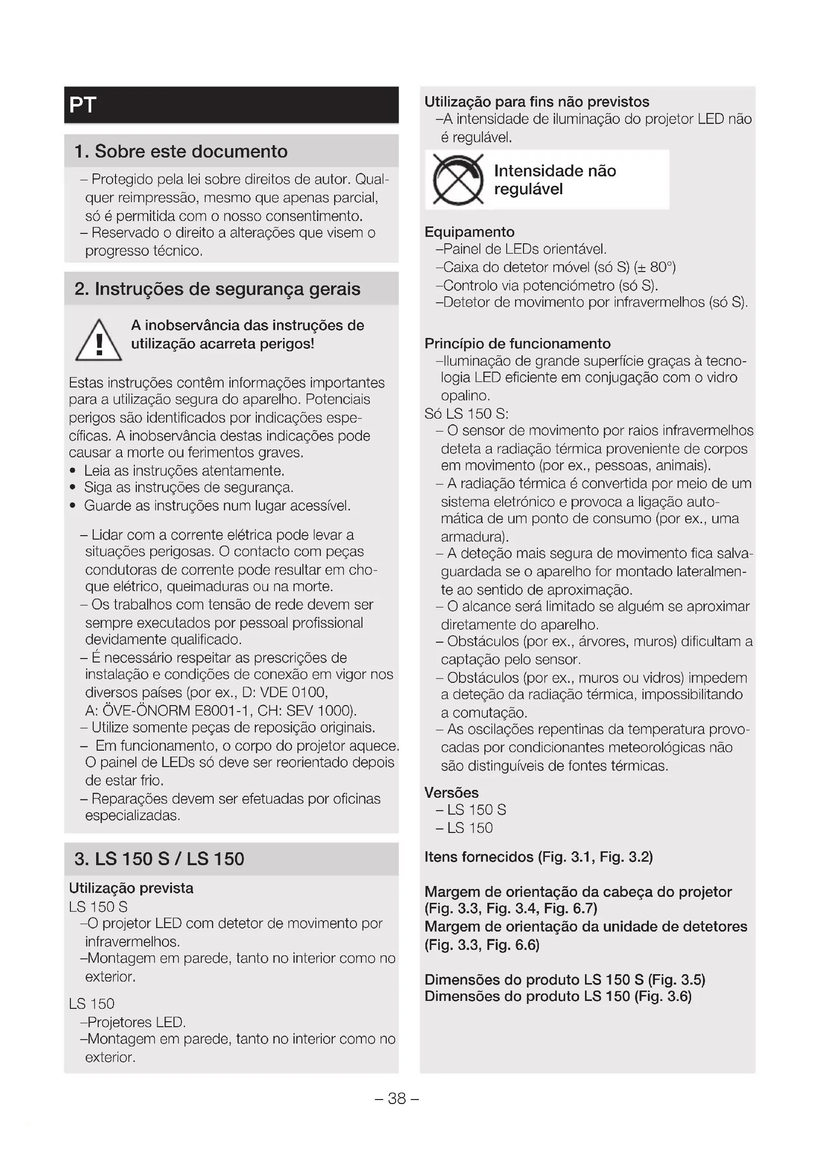 Utilização prevista LS150S – O projetor LED com detetor de movimento por infravermelhos. – Montagem em parede, tanto no interior como no exterior. LS150 – Projetores LED. – Montagem em parede, tanto no interior como no exterior. Utilização para fins não previstos – A intensidade de iluminação do projetor LED não é regulável. Intensidade não regulável Equipamento – Painel de LEDs orientável. – Caixa do detetor móvel (só S) (±80°) – Controlo via potenciómetro (só S). – Detetor de movimento por infravermelhos (só S). Princípio de funcionamento – Iluminação de grande superfície graças à tecno- logia LED eficiente em conjugação com o vidro opalino. Só LS150S: – O sensor de movimento por raios infravermelhos deteta a radiação térmica proveniente de corpos em movimento (por ex., pessoas, animais). – A radiação térmica é convertida por meio de um sistema eletrónico e provoca a ligação auto- mática de um ponto de consumo (porex., uma armadura). – A deteção mais segura de movimento fica salva- guardada se o aparelho for montado lateralmen- te ao sentido de aproximação. – O alcance será limitado se alguém se aproximar diretamente do aparelho. – Obstáculos (por ex., árvores, muros) dificultam a captação pelo sensor. – Obstáculos (porex., muros ou vidros) impedem a deteção da radiação térmica, impossibilitando a comutação. – As oscilações repentinas da temperatura provo- cadas por condicionantes meteorológicas não são distinguíveis de fontes térmicas. Versões – LS150S – LS150 Itens fornecidos (Fig. 3.1, Fig.3.2) Margem de orientação da cabeça do projetor (Fig.3.3, Fig.3.4, Fig.6.7) Margem de orientação da unidade de detetores (Fig. 3.3, Fig.6.6) Dimensões do produto LS150S (Fig. 3.5) Dimensões do produto LS150 (Fig. 3.6)– 39 – Vista geral do aparelho LS150S (Fig. 3.7) A Painel de LEDs B Corpo C Suporte de fixação à parede D Ajuste do tempo E Regulação crepuscular F Unidade de detetores G Friso anelar Vista geral do aparelho LS150S (Fig. 3.8) A Painel de LEDs B Corpo C Suporte de fixação à parede Dados técnicos – Dimensões (a×l×p): LS150S: 210×155×176mm LS150: 178×157×178mm – Potência (P