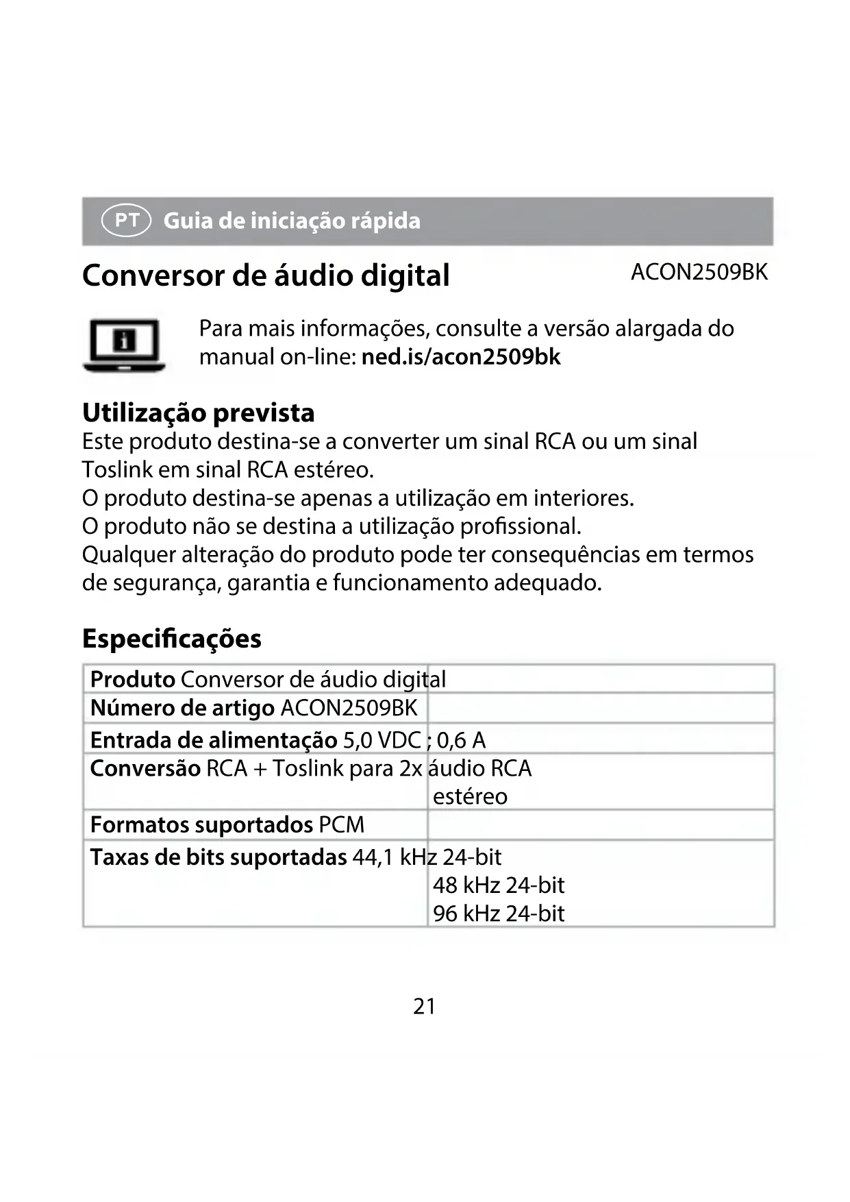 Guia de iniciação rápida Conversor de áudio digital ACON2509BK Para mais informações, consulte a versão alargada do manual on-line: ned.is/acon2509bk Utilização prevista Este produto destina-se a converter um sinal RCA ou um sinal Toslink em sinal RCA estéreo. O produto destina-se apenas a utilização em interiores. O produto não se destina a utilização prossional. Qualquer alteração do produto pode ter consequências em termos de segurança, garantia e funcionamento adequado. Especicações Produto Conversor de áudio digital Número de artigo ACON2509BK Entrada de alimentação 5,0 VDC ; 0,6 A Conversão RCA + Toslink para 2x áudio RCA estéreo Formatos suportados PCM Taxas de bits suportadas 44,1 kHz 24-bit 48 kHz 24-bit 96 kHz 24-bit22 Peças principais (imagem A)