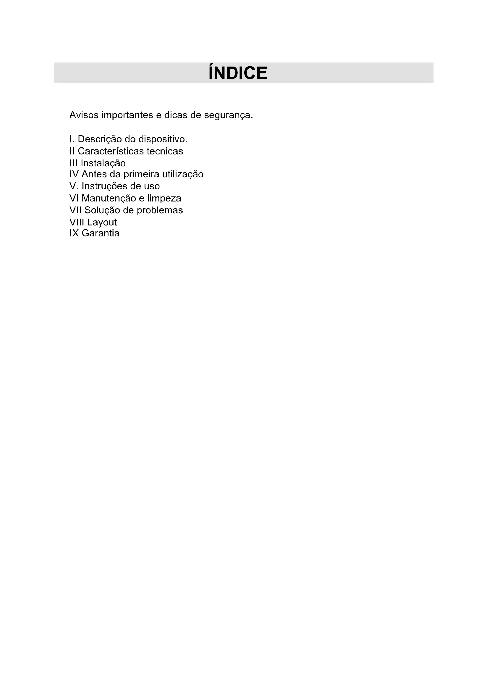 II Características tecnicas III Instalação IV Antes da primeira utilização