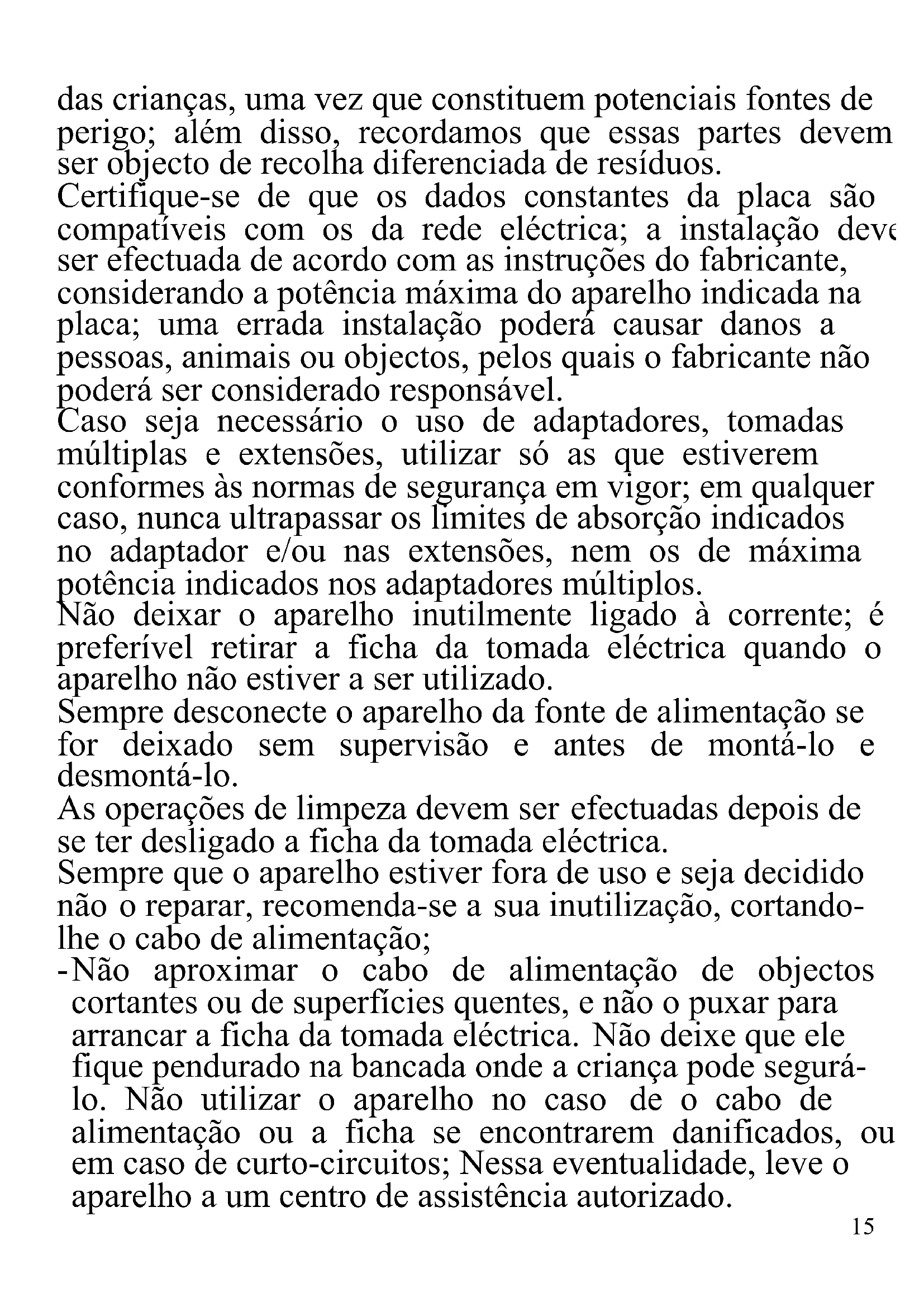 As indicações seguintes são muito importantes no que se refere à instalação, uso e manutenção deste aparelho; conserve com cuidado este manual para eventuais futuras consultas; utilize o aparelho apenas do modo indicado neste manual de instruções; outro tipo de utilização deverá considerar-se inadequado e perigoso; por isso, o fabricante não poderá ser considerado responsável na eventualidade de ocorrerem danos resultantes de uso indevido, errado ou irresponsável. Antes de utilizar, certifique-se da integridade do aparelho; em caso de dúvida não o utilize e dirija-se à assistência técnica autorizada; não deixe partes da embalagem (sacos de plástico, esferovite, pregos, agrafos, etc.) ao alcance15 das crianças, uma vez que constituem potenciais fontes de perigo; além disso, recordamos que essas partes devem ser objecto de recolha diferenciada de resíduos. Certifique-se de que os dados constantes da placa são compatíveis com os da rede eléctrica; a instalação deve ser efectuada de acordo com as instruções do fabricante, considerando a potência máxima do aparelho indicada na placa; uma errada instalação poderá causar danos a pessoas, animais ou objectos, pelos quais o fabricante não poderá ser considerado responsável. Caso seja necessário o uso de adaptadores, tomadas múltiplas e extensões, utilizar só as que estiverem conformes às normas de segurança em vigor; em qualquer caso, nunca ultrapassar os limites de absorção indicados no adaptador e/ou nas extensões, nem os de máxima potência indicados nos adaptadores múltiplos. Não deixar o aparelho inutilmente ligado à corrente; é preferível retirar a ficha da tomada eléctrica quando o aparelho não estiver a ser utilizado. Sempre desconecte o aparelho da fonte de alimentação se for deixado sem supervisão e antes de montá-lo e desmontá-lo. As operações de limpeza devem ser efectuadas depois de se ter desligado a ficha da tomada eléctrica. Sempre que o aparelho estiver fora de uso e seja decidido não o reparar, recomenda-se a sua inutilização, cortando- lhe o cabo de alimentação; - Não aproximar o cabo de alimentação de objectos cortantes ou de superfícies quentes, e não o puxar para arrancar a ficha da tomada eléctrica. Não deixe que ele fique pendurado na bancada onde a criança pode segurá- lo. Não utilizar o aparelho no caso de o cabo de alimentação ou a ficha se encontrarem danificados, ou em caso de curto-circuitos; Nessa eventualidade, leve o aparelho a um centro de assistência autorizado.16 - Não expor o aparelho a condições atmosféricas adversas, como chuva, humidade, gelo. Conserve em lugares secos - As crianças não devem brincar com o aparelho. - Não manusear ou tocar o aparelho com as mãos molhadas ou os pés descalços. - Este aparelho não pode ser usado por crianças, mesmo com mais de 8 anos. - Este aparelho pode ser por pessoas com reduzida capacidade física, sensorial ou mental, ou ainda com falta de experiência na sua utilização, desde que lhes seja assegurada uma adequada supervisão ou se tiverem sido instruídas no uso do aparelho em segurança. - Mantenha o aparelho e o cabo de alimentação fora do alcance de crianças com menos de 8 anos de idade. Não indicado para uso comercial. Só para uso doméstico. Em caso de avaria e/ou de mau funcionamento, não intervenha sobre o aparelho. Para uma eventual reparação dirija-se unicamente a um centro autorizado pelo fabricante e solicite peças de substituição originais. A não observância destas indicações pode comprometer a segurança do aparelho e tornar inválida a garantia - Este aparelho foi concebido para uso doméstico ou equivalente, em situações como as de refeitórios em pequenas empresas ou outros ambientes de natureza laboral; por clientes de hotéis, motéis ou acomodação turística, como turismo rural ou residencial. - Este aparelho não foi concebido para ser utilizado por intermédio de um temporizador externo ou de um sistema de comando à distância autónomo. - Antes de cada utilização, soltar o cabo de alimentação. - Utilizar somente acessórios e componentes originais. Não sujeite produto a impactos, pois isso pode danificá-lo - Manter o aparelho afastado de materiais inflamáveis, fontes de calor, zonas frias e vapor.17