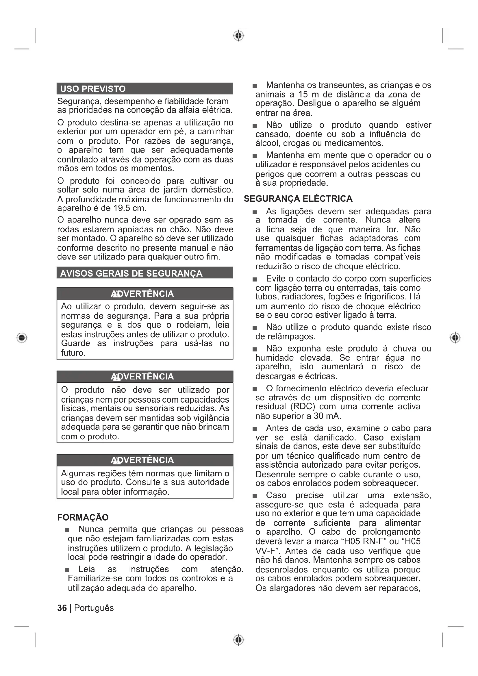 GEBRUIKSAANWIJZING Met een contactdoos verbinden Trek uit de contactdoos Onderdelen of accessoires afzonderlijk verkocht OPMERKING: WAARSCHUWING36 | Português USO PREVISTO 6HJXUDQoDGHVHPSHQKRH¿DELOLGDGHIRUDP as prioridades na conceção da alfaia elétrica. O produto destina-se apenas a utilização no exterior por um operador em pé, a caminhar com o produto. Por razões de segurança, o aparelho tem que ser adequadamente controlado através da operação com as duas mãos em todos os momentos. O produto foi concebido para cultivar ou soltar solo numa área de jardim doméstico. A profundidade máxima de funcionamento do aparelho é de 19.5 cm. O aparelho nunca deve ser operado sem as rodas estarem apoiadas no chão. Não deve ser montado. O aparelho só deve ser utilizado conforme descrito no presente manual e não