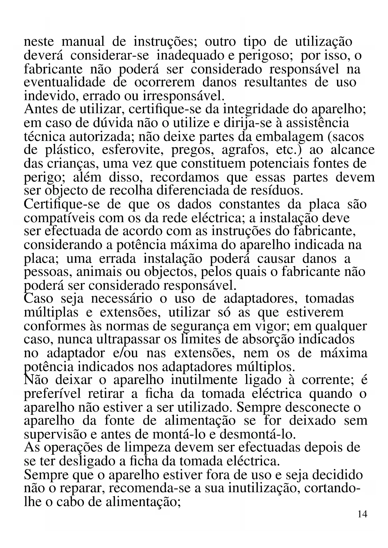 As indicações seguintes são muito importantes no que se refere à instalação, uso e manutenção deste aparelho; conserve com cuidado este manual para eventuais futuras consultas; utilize o aparelho apenas do modo indicado14 neste manual de instruções; outro tipo de utilização deverá considerar-se inadequado e perigoso; por isso, o fabricante não poderá ser considerado responsável na eventualidade de ocorrerem danos resultantes de uso indevido, errado ou irresponsável. Antes de utilizar, certifique-se da integridade do aparelho; em caso de dúvida não o utilize e dirija-se à assistência técnica autorizada; não deixe partes da embalagem (sacos de plástico, esferovite, pregos, agrafos, etc.) ao alcance das crianças, uma vez que constituem potenciais fontes de perigo; além disso, recordamos que essas partes devem ser objecto de recolha diferenciada de resíduos. Certifique-se de que os dados constantes da placa são compatíveis com os da rede eléctrica; a instalação deve ser efectuada de acordo com as instruções do fabricante, considerando a potência máxima do aparelho indicada na placa; uma errada instalação poderá causar danos a pessoas, animais ou objectos, pelos quais o fabricante não poderá ser considerado responsável. Caso seja necessário o uso de adaptadores, tomadas múltiplas e extensões, utilizar só as que estiverem conformes às normas de segurança em vigor; em qualquer caso, nunca ultrapassar os limites de absorção indicados no adaptador e/ou nas extensões, nem os de máxima potência indicados nos adaptadores múltiplos. Não deixar o aparelho inutilmente ligado à corrente; é preferível retirar a ficha da tomada eléctrica quando o aparelho não estiver a ser utilizado. Sempre desconecte o aparelho da fonte de alimentação se for deixado sem supervisão e antes de montá-lo e desmontá-lo. As operações de limpeza devem ser efectuadas depois de se ter desligado a ficha da tomada eléctrica. Sempre que o aparelho estiver fora de uso e seja decidido não o reparar, recomenda-se a sua inutilização, cortando- lhe o cabo de alimentação;15 - Não aproximar o cabo de alimentação de objectos cortantes ou de superfícies quentes, e não o puxar para arrancar a ficha da tomada eléctrica. Não deixe que ele fique pendurado na bancada onde a criança pode segurá- lo. Não utilizar o aparelho no caso de o cabo de alimentação ou a ficha se encontrarem danificados, ou em caso de curto-circuitos; Nessa eventualidade, leve o aparelho a um centro de assistência autorizado. - Não expor o aparelho a condições atmosféricas adversas, como chuva, humidade, gelo. Conserve em lugar seco. - Não manusear ou tocar o aparelho com as mãos molhadas ou os pés descalços. - Este aparelho não pode ser usado por crianças, mesmo com mais de 8 anos. - Este aparelho pode ser por pessoas com reduzida capacidade física, sensorial ou mental, ou ainda com falta de experiência na sua utilização, desde que lhes seja assegurada uma adequada supervisão ou se tiverem sido instruídas no uso do aparelho em segurança. - As crianças não devem brincar com o aparelho. - Mantenha o aparelho e o cabo de alimentação fora do alcance de crianças com menos de 8 anos de idade. - Não indicado para uso comercial. Só para uso doméstico. Em caso de avaria e/ou de mau funcionamento, não intervenha sobre o aparelho. Para uma eventual reparação dirija-se unicamente a um centro autorizado pelo fabricante e solicite peças de substituição originais. A não observância destas indicações pode comprometer a segurança do aparelho e tornar inválidos os termos da garantia. - Antes de cada utilização, soltar o cabo de alimentação. - Este aparelho foi concebido para uso doméstico ou equivalente, em situações como as de refeitórios em pequenas empresas ou outros ambientes de natureza16 laboral; por clientes de hotéis, motéis ou acomodação turística, como turismo rural ou residencial. - Este aparelho não foi concebido para ser utilizado por intermédio de um temporizador externo ou de um sistema de comando à distância autónomo. - Utilizar somente acessórios e componentes originais. - Manter o aparelho afastado de materiais inflamáveis, fontes de calor, zonas frias e vapor. Não sujeite produto a impactos, pois isso pode danificá-lo