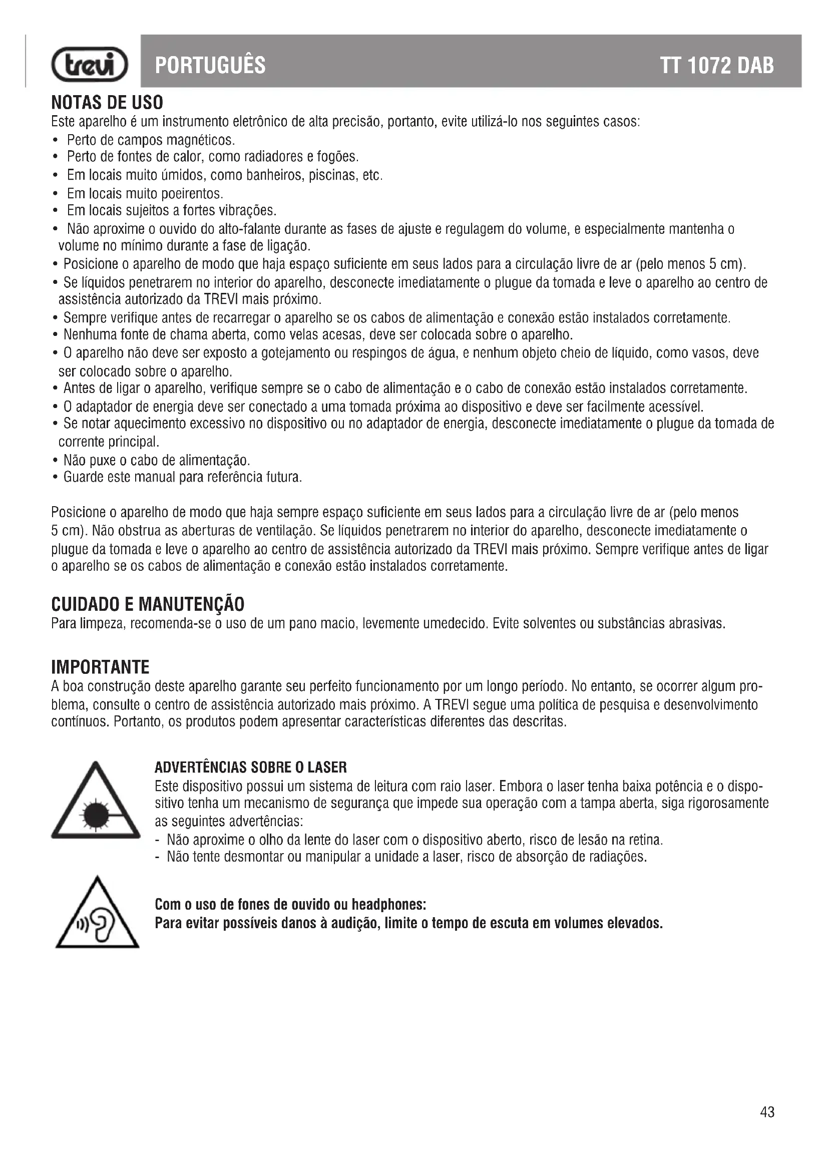 Para limpeza, recomenda-se o uso de um pano macio, levemente umedecido. Evite solventes ou substâncias abrasivas. IMPORTANTE A boa construção deste aparelho garante seu perfeito funcionamento por um longo período. No entanto, se ocorrer algum pro- blema, consulte o centro de assistência autorizado mais próximo. A TREVI segue uma política de pesquisa e desenvolvimento contínuos. Portanto, os produtos podem apresentar características diferentes das descritas.44 TT 1072 DAB